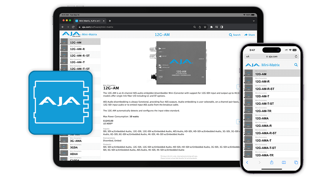 Mini-Matrix offers information on the complete line of AJA Mini-Converters as a convenient search tool, available online. The Mini-Converter product line is extensive and this app helps you find the right converter for any situation, wherever you are. Please click here to use Mini-Matrix to help find the AJA Mini-Converter you need.