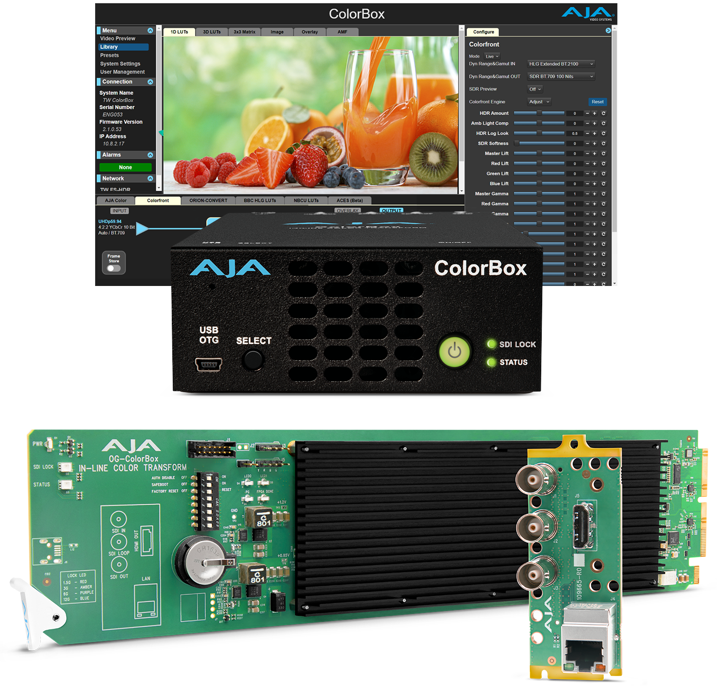 Built around the 33pt 3D LUT processor with tetrahedral interpolation, the AJA Color Pipeline provides additional 4x 1D LUTs and 2x 3x3 matrices that are each individually configurable or can be converted to Proc Amps or RGB Color Correctors. All of the color processing options can be easily managed via the web user interface, which can be accessed directly from a wired Ethernet connection or through a wireless connection via a third party WiFi USB adapter.