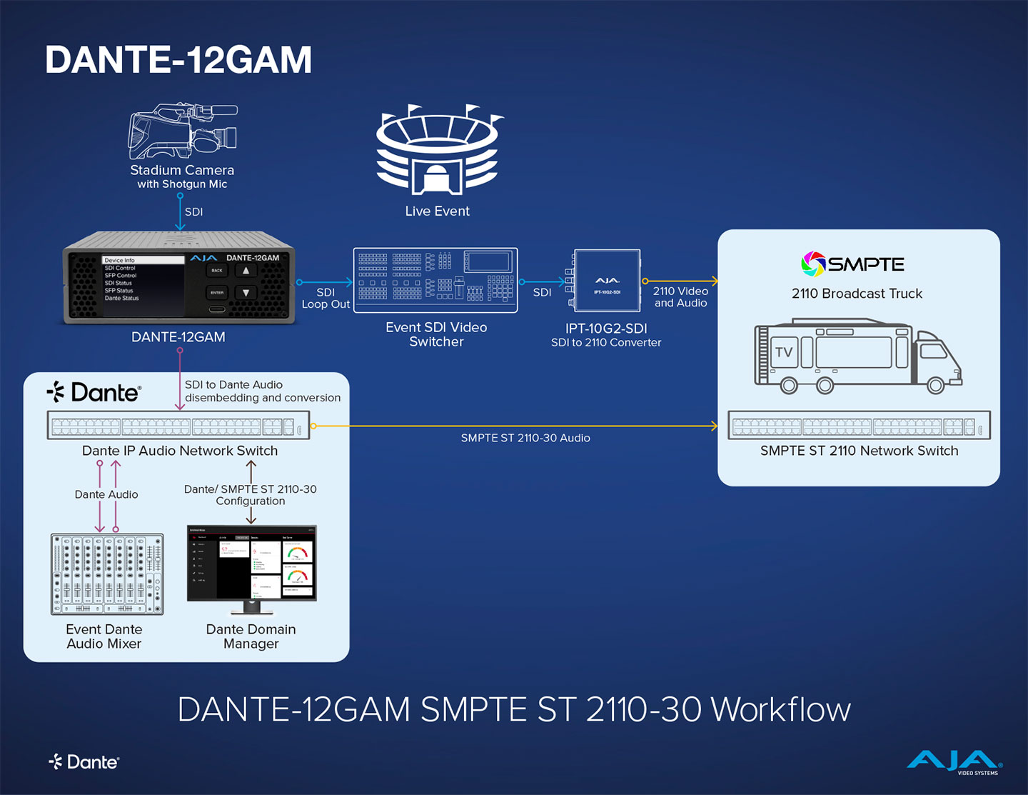 In this workflow, the DANTE-12GAM activates a SMPTE ST 2110 IP audio workflow. The stadium camera with an attached shotgun mic is picking up the crowd noise, and the audio is disembedded from the SDI stream and converted to Dante audio to go into the audio mixer, held in sync by the grand master PTP clock connected to both the Dante and SMPTE networks. Dante Domain Manager software is required to configure the Dante audio stream for it to be also recognized as a 2110-30 AoIP and send that into the SMPTE network for mixing and eventual distribution.