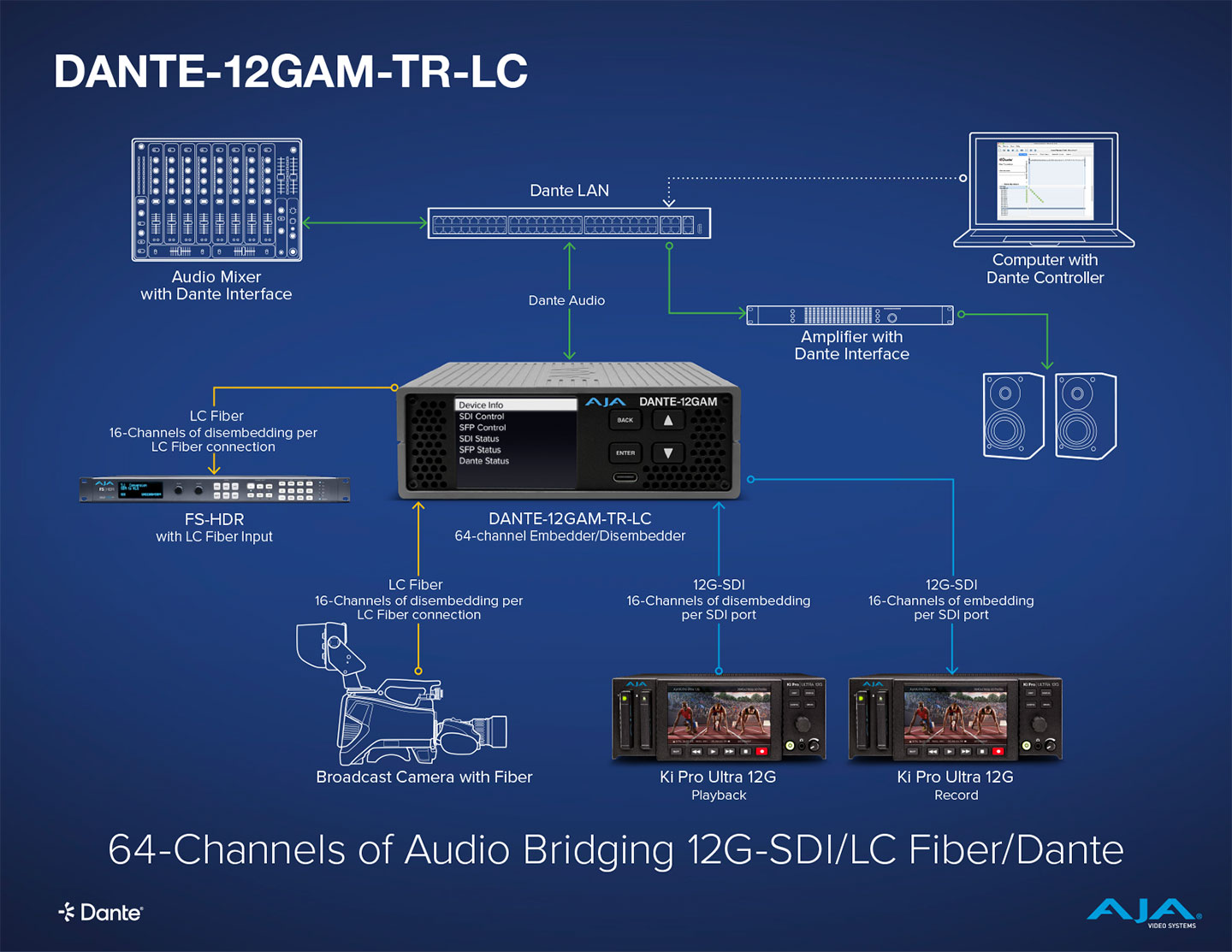 The DANTE-12GAM, with its optional LC Fiber SFP, doubles the capability of this highly portable converter to 64 bidirectional channels of embedding/disembedding. As illustrated in the workflow here, the DANTE-12GAM, using the SDI connectors, is doing 16-channels in and 16-channels out of embedding/disembedding from the Ki Pro Ultra 12G, for 32-channels total. With the installed LC Fiber SFP, you are doubling the channel count with an additional 16-channels of audio disembedding from the fiber connected broadcast camera while also embedding 16-channels of audio to the FS-HDR utilizing the fiber connections it supports via optional SFPs. All told, 64-channels of Dante IP audio embedding/disembedding are available in a compact, rock-solid device, tailor made for solving those last-minute production challenges.