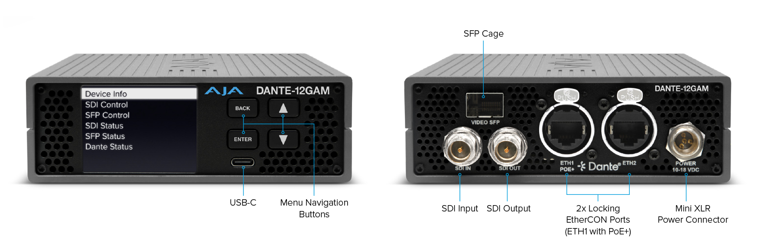 The DANTE-12GAM utilizes a rugged new aluminum enclosure, offering a front panel display, physical push-button controls, USB-C connectivity for initial Static IP configuration, and active cooling designed with front-to-back airflow. The onboard display reports status and configuration and is paired with buttons for enter, back, up, and down for easy access to settings for standalone operation.