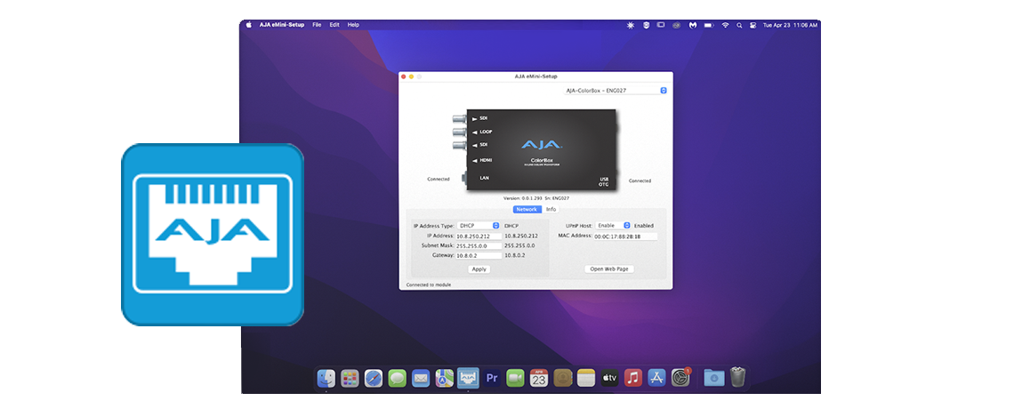 AJA eMini-Setup software allows quick and easy network settings configuration and web page UI connection access for the DANTE-12GAM, HELO Plus, ColorBox, KUMO, and IP Mini-Converters.