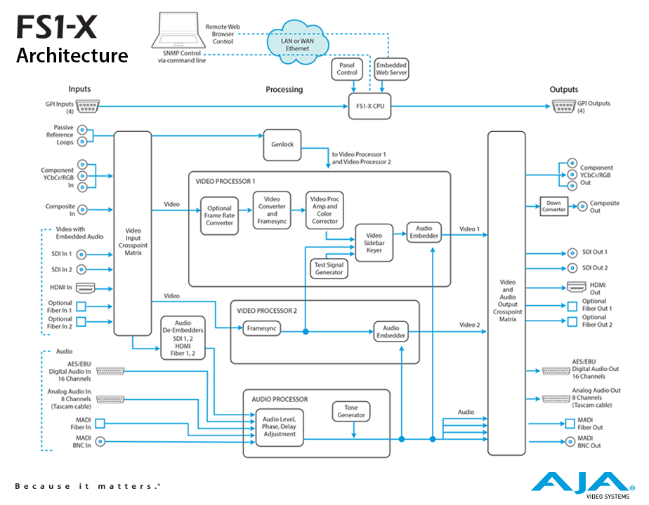 Matching up and synchronizing disparate video and audio formats is a critical part of any broadcast, mobile or postproduction environment. Within its compact 1RU chassis, FS1-X integrates an amazing array of video and audio connectivity and processing. Featuring a flexible architecture, FS1-X simultaneously works with a range of video connectivity from analog to 3G-SDI 10-bit broadcast quality video and incorporates embedded audio, AES, MADI, and analog audio.