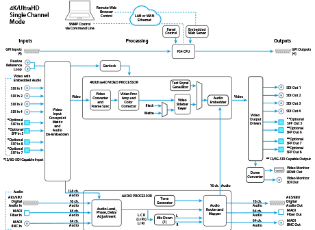 Single Channel Mode provides a full suite of 4K/UltraHD processing and up, down, cross-conversion to and from 2K, HD, or SD.