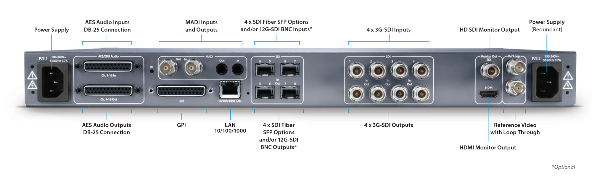FS4 utilizes standard BNC as well as optional SFP inputs and outputs to integrate easily into a variety of workflows and facilities with support for SDI workflows all the way up to 12G.