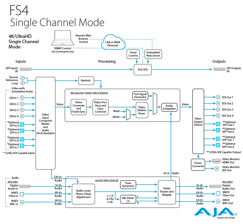 In Single Channel Mode, FS4 will up-convert your HD or SD materials to 4K/UltraHD or down-convert your 4K/UltraHD to HD and supports a huge array of audio channels over Embedded SDI, AES, and MADI for an incredible 272x208 matrix of audio processing capabilities.