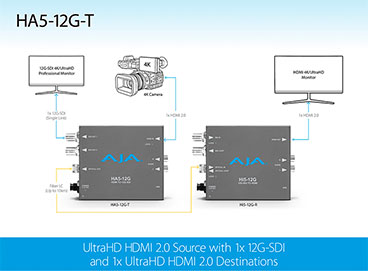 AJA’s HA5-12G converts an HDMI 2.0 input to 12G-SDI for 4K/UltraHD single link outputs. HA5-12G includes two 12G-SDI distribution amplifier outputs with 8 or 2-channels of embedded audio from an HDMI source or two-channel analog audio (RCA) input.