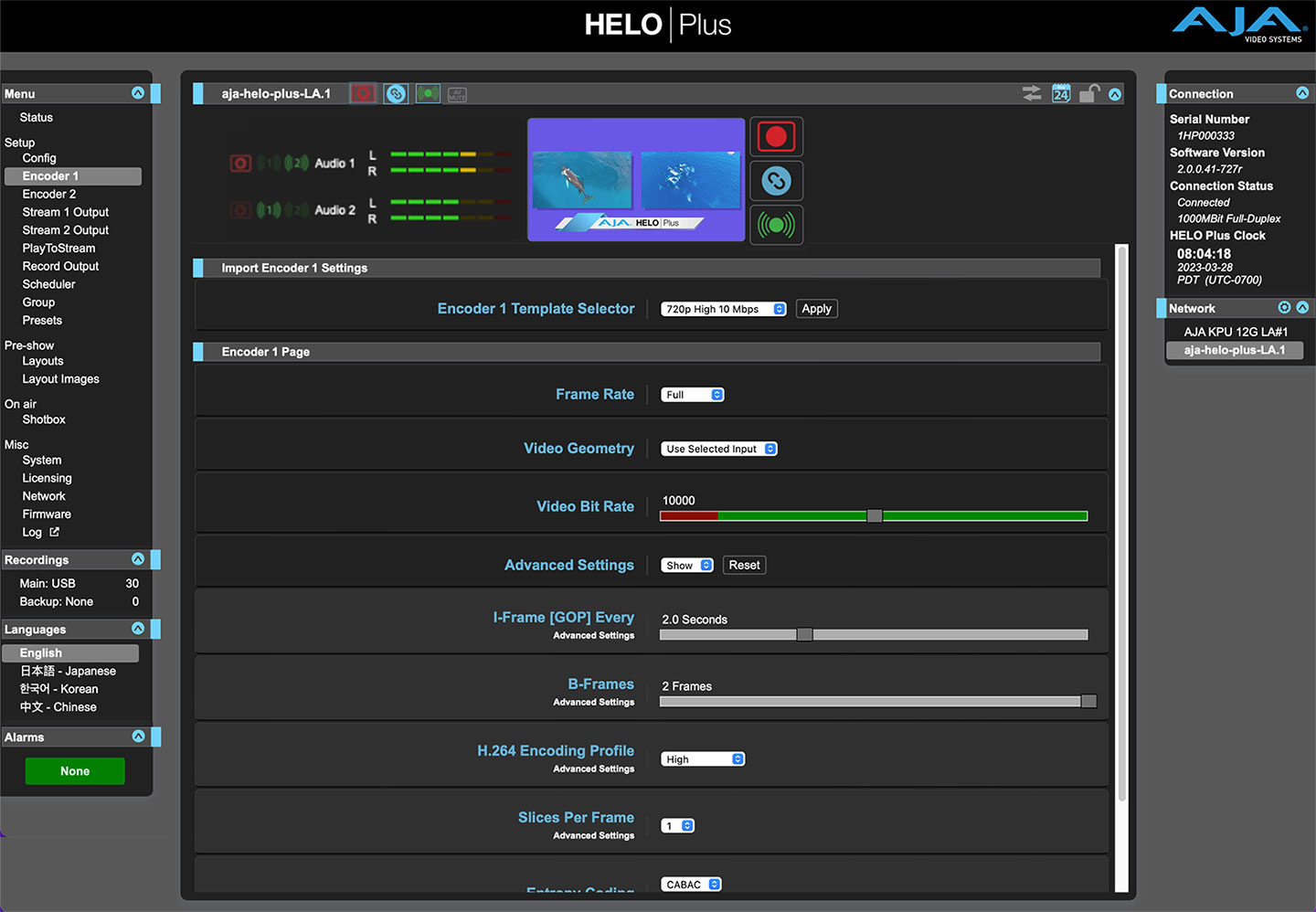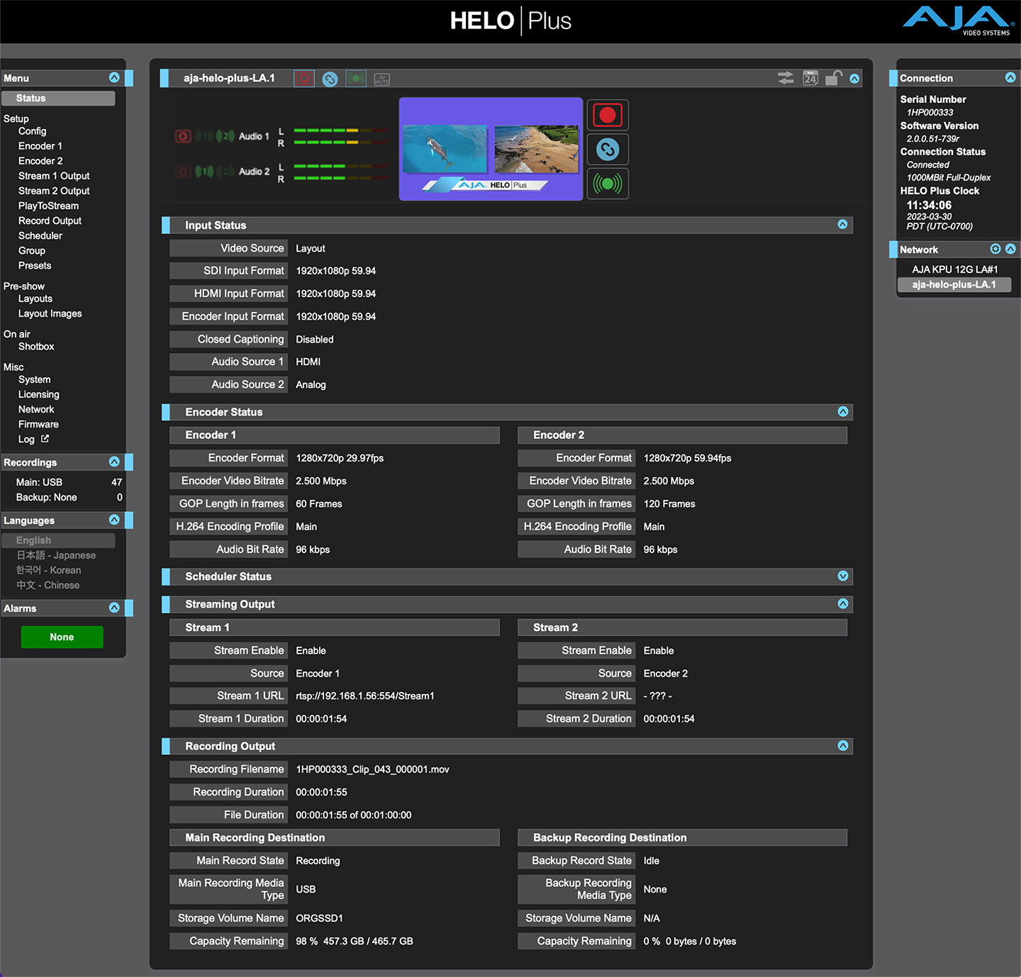 HELO Plus can be easily configured remotely on a standard web browser, via the Ethernet connection, and using a desktop computer, laptop or iPad. Every function of HELO Plus is accessible in the Web UI, with multiple HELO Plus devices being easily controllable via a tabbed browser window. Once set up to your requirements, HELO Plus can also be controlled via the stream and record buttons on the front of the device, with audio level LED meters providing feedback for monitoring, or the system can be controlled directly from the included web-based UI. There’s also the option for remote control via the system’s integrated REST API. Elgato’s Stream Deck, with the new AJA plug-in found on their marketplace, uses the REST API to drive Key Actions of the HELO Plus and even unlock more features available only through the REST API.