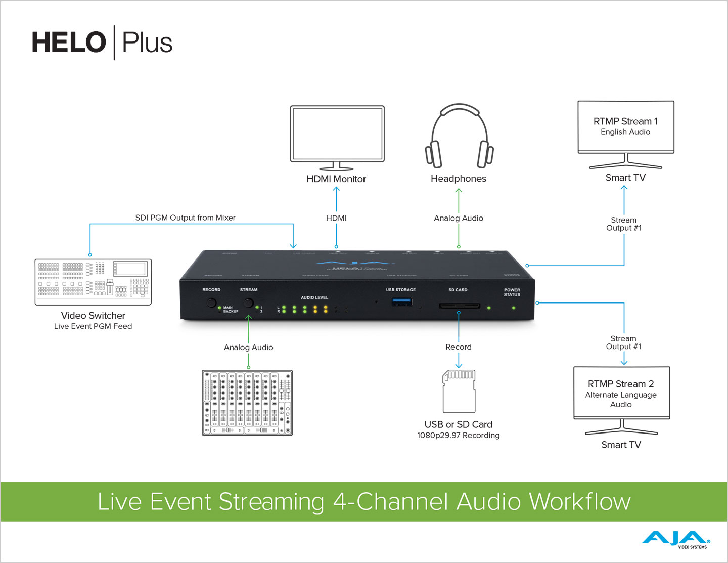The 4-channel audio option on the HELO Plus expands the number of audio channels available for streaming and recording from a single stereo pair to two stereo pairs, for a total of four channels.