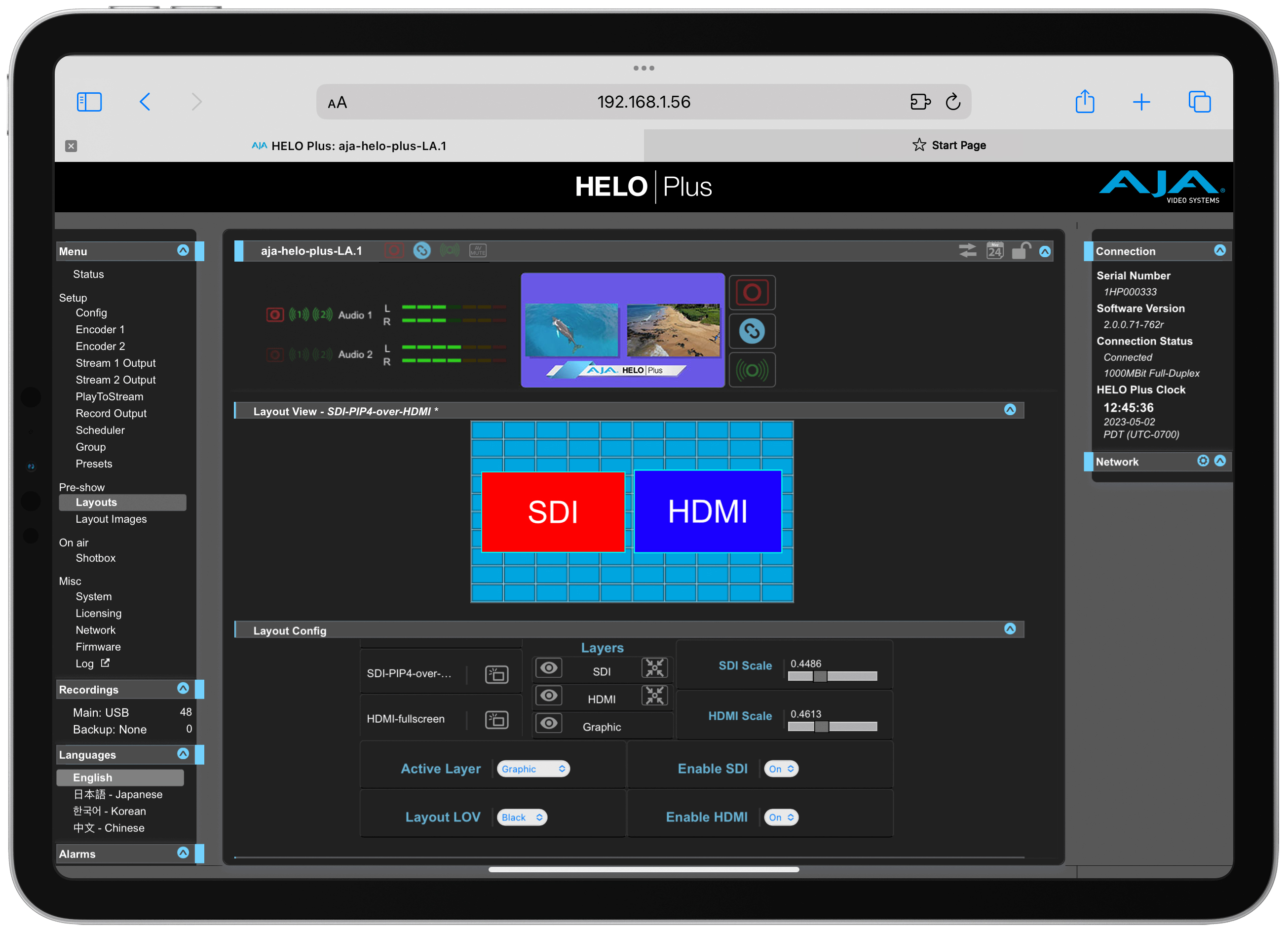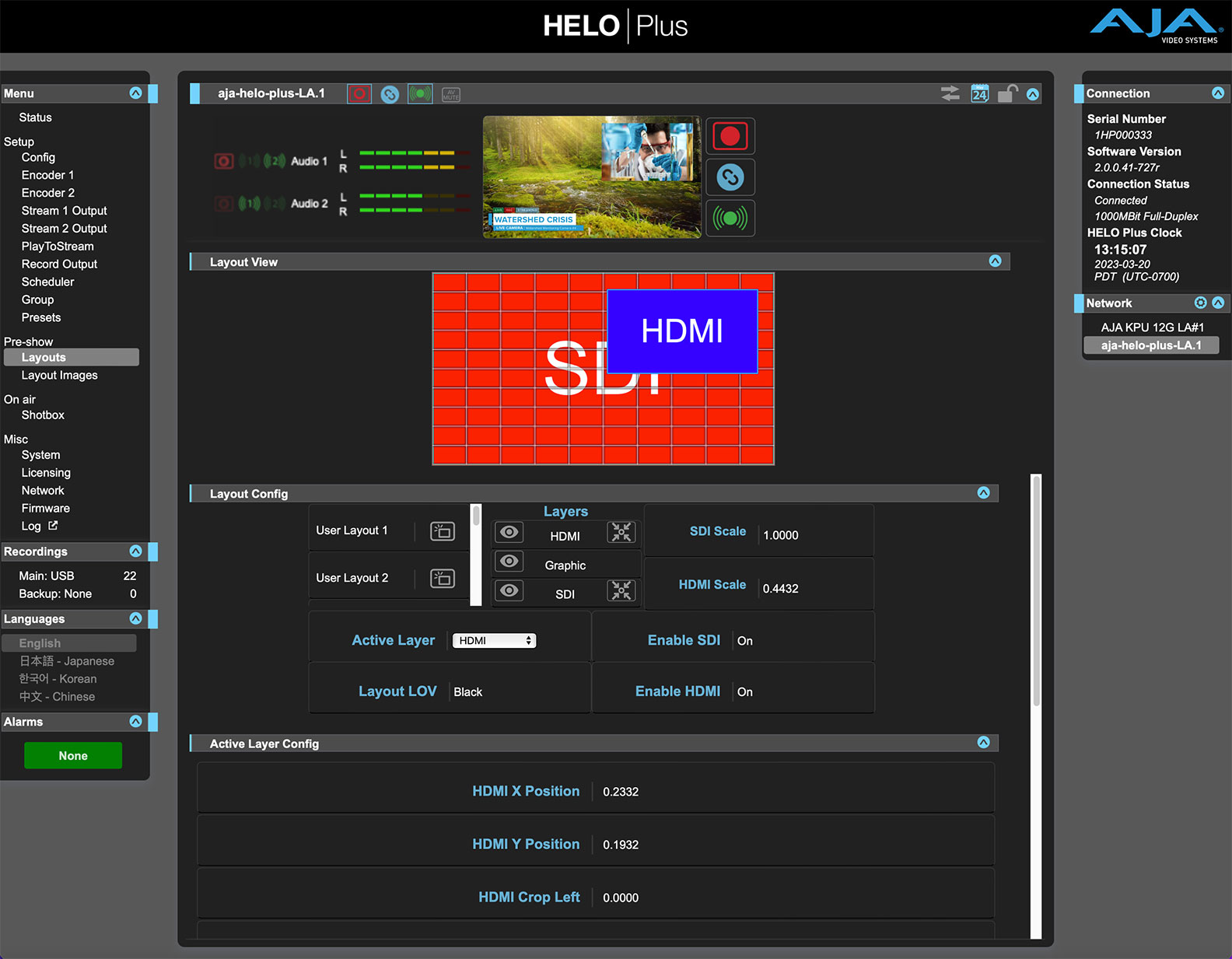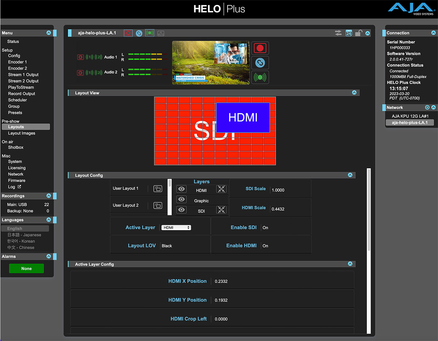HELO Plus brings an exciting layouts feature, allowing multiple inputs to be combined into a single screen with a graphic element overlay. A layout enables the user to combine the SDI input and the HDMI input into a single output stream and then add a graphic (video + key) into that composite. The layout can have up to four layers, and their priority can be arbitrarily adjusted to suit the customer’s needs.