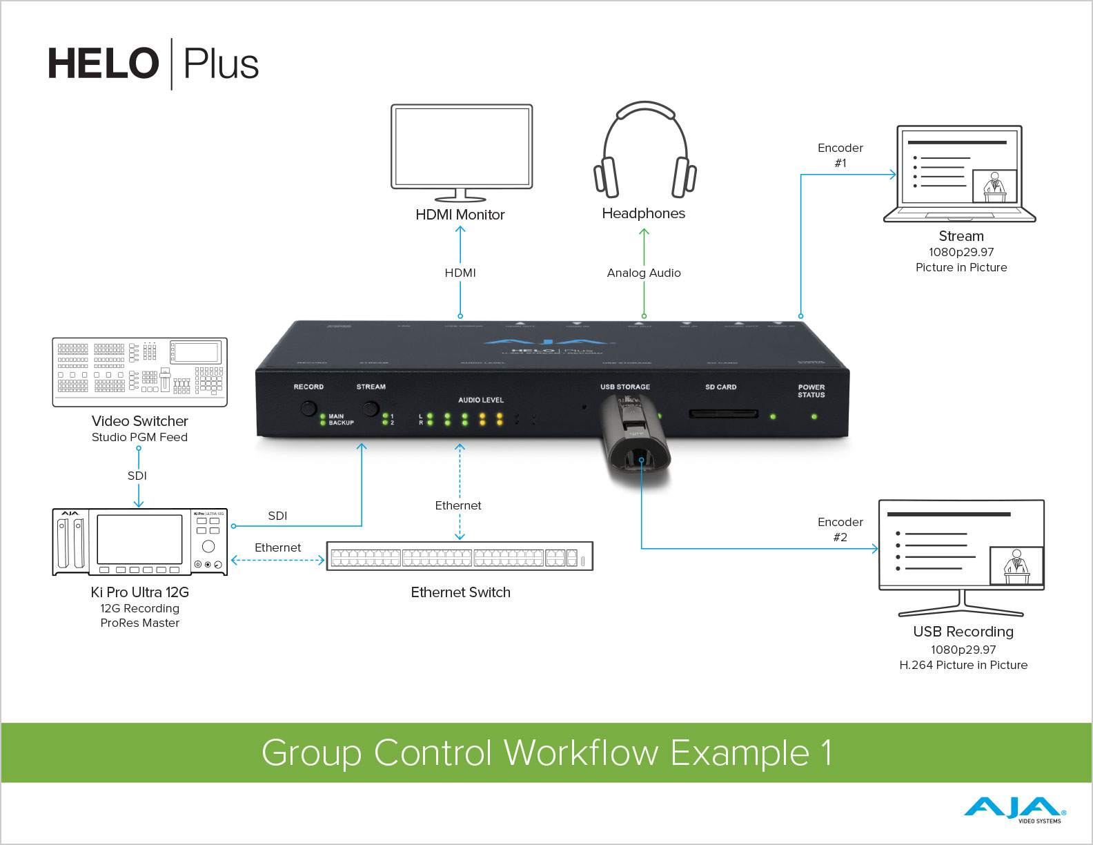 Grouping HELO Plus with other AJA video devices offers even more sophisticated control, with simultaneous synchronization for recording and streaming across multiple devices.