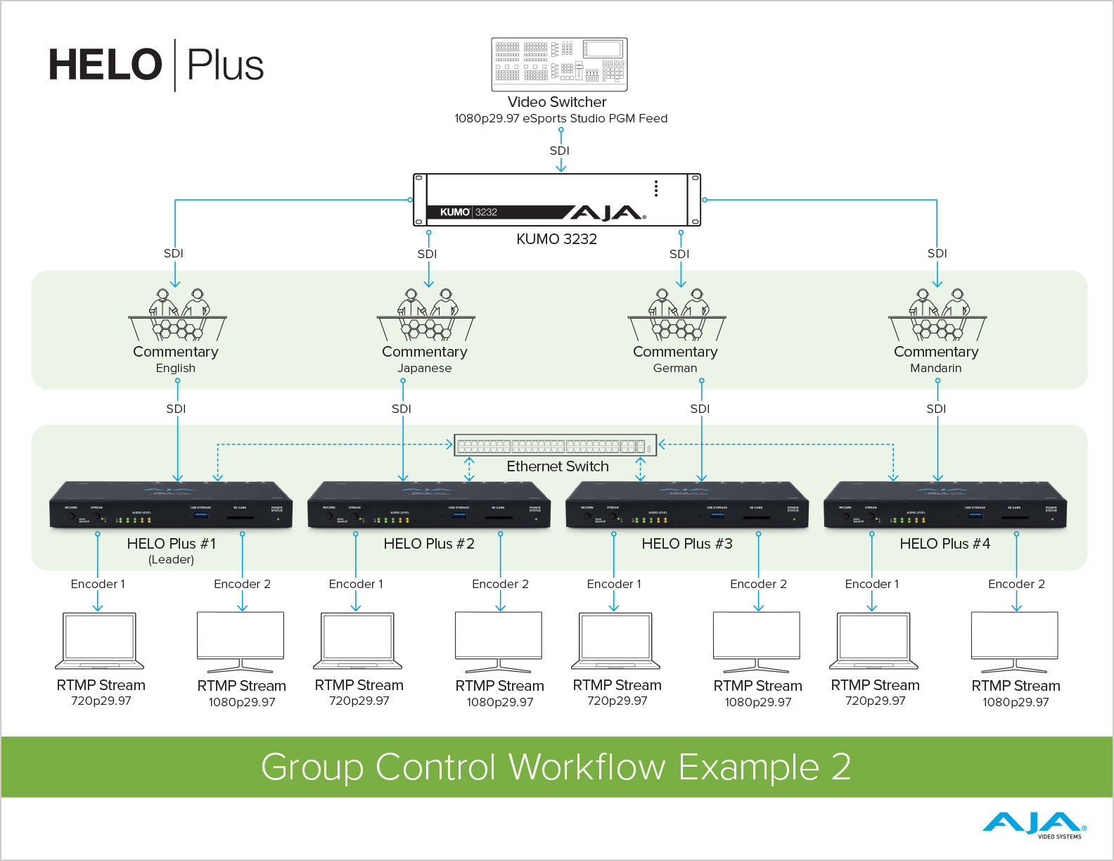 In this use case, an eSports video with an embedded audio feed is distributed to four commentary studios via an AJA KUMO 3232 SDI router. Each commentary studio embeds its respective mixed audio track for each region. Each commentary studio passes out the SDI video and newly embedded commentary audio mix to a HELO Plus, four in total, each connected to the others via an Ethernet switch.