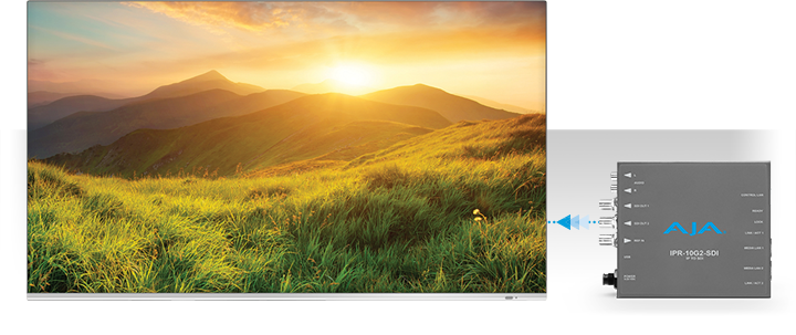 The AJA IPR-10G2-SDI receives SMPTE ST 2110 IP video and audio, then formats the data for output over 3G-SDI.