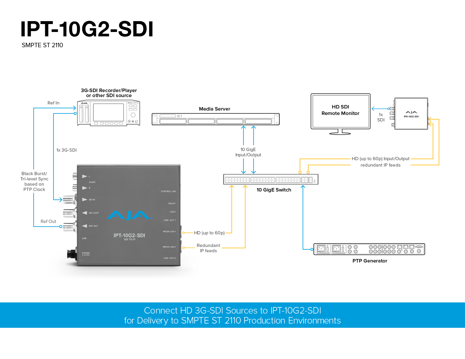 IPT-10G2-SDI Mini-Converter transmits a SMPTE ST 2110 essence derived from an incoming 3G-SDI input source. Providing two SFP+ cages for redundancy protection via "hitless switching", IPT-10G2-SDI is rugged, quiet and fanless. AJA Mini-Converter design is ideal for placement in a wide range of display and device scenarios, from studios to field.