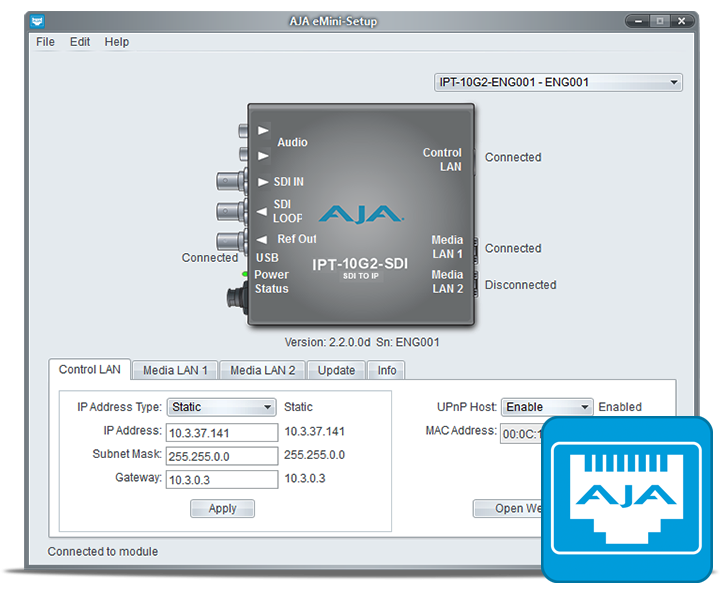 IPT-10G2-SDI provides two key methods for control. The Control LAN Ethernet port enables control of the Mini-Converter from web browsers on any platform and REST clients. The mini-USB connector facilitates quick and simple initial network configuration and firmware updates with AJA eMini Setup software.