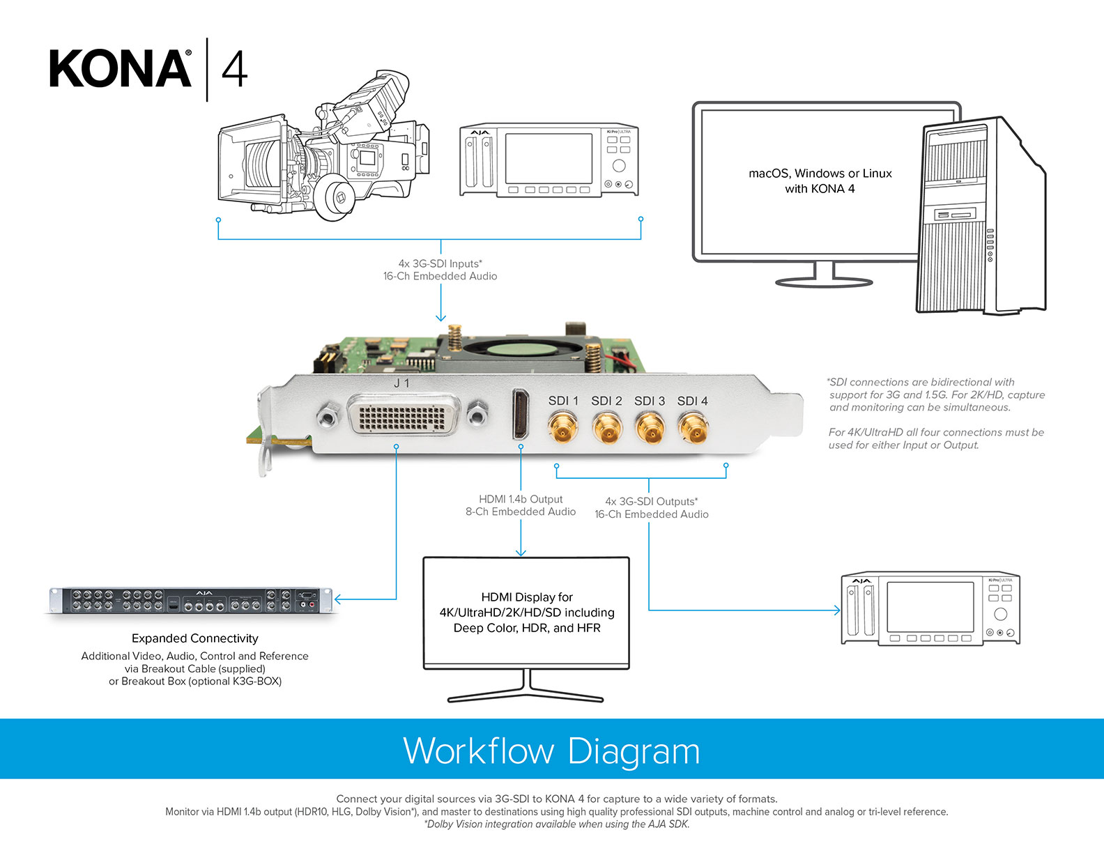 KONA 4 features bi-directional 3G-SDI connections that can be used for input and output. 16-Channels of embedded audio over SDI for multi-channel audio work and HDMI 2.0b monitoring output. LTC I/O, Genlock input, RS-422 control, configurable 3 x BNC SD/HD analog video output and 8-channel AES audio I/O with the K3G-Box all allow KONA 4 to integrate into a variety of workflows from HDR to HFR, 4K to Multi-Channel HD for streaming and more.