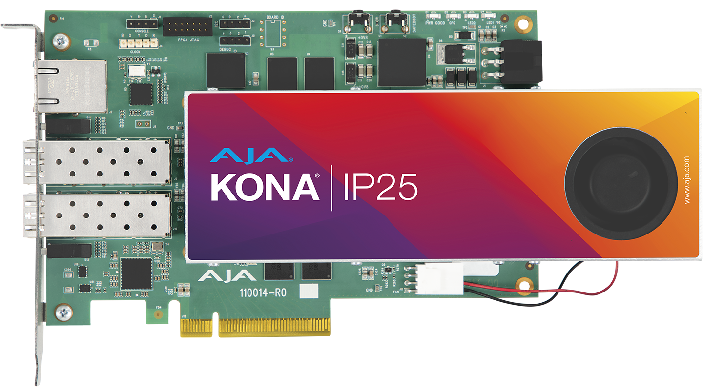 KONA IP25 delivers the power, quality, reliability, and ease of use of the KONA family to support the latest SMPTE ST 2110 workflows. The KONA IP25 is an 8-lane PCIe Gen 4.0, SMPTE ST 2110 IP I/O card supporting bidirectional uncompressed video. KONA IP25 has two SFP cages that support 10 and 25 Gigabit Ethernet (10/25 GigE) SFPs and also includes a 1 GigE RJ-45 connector.