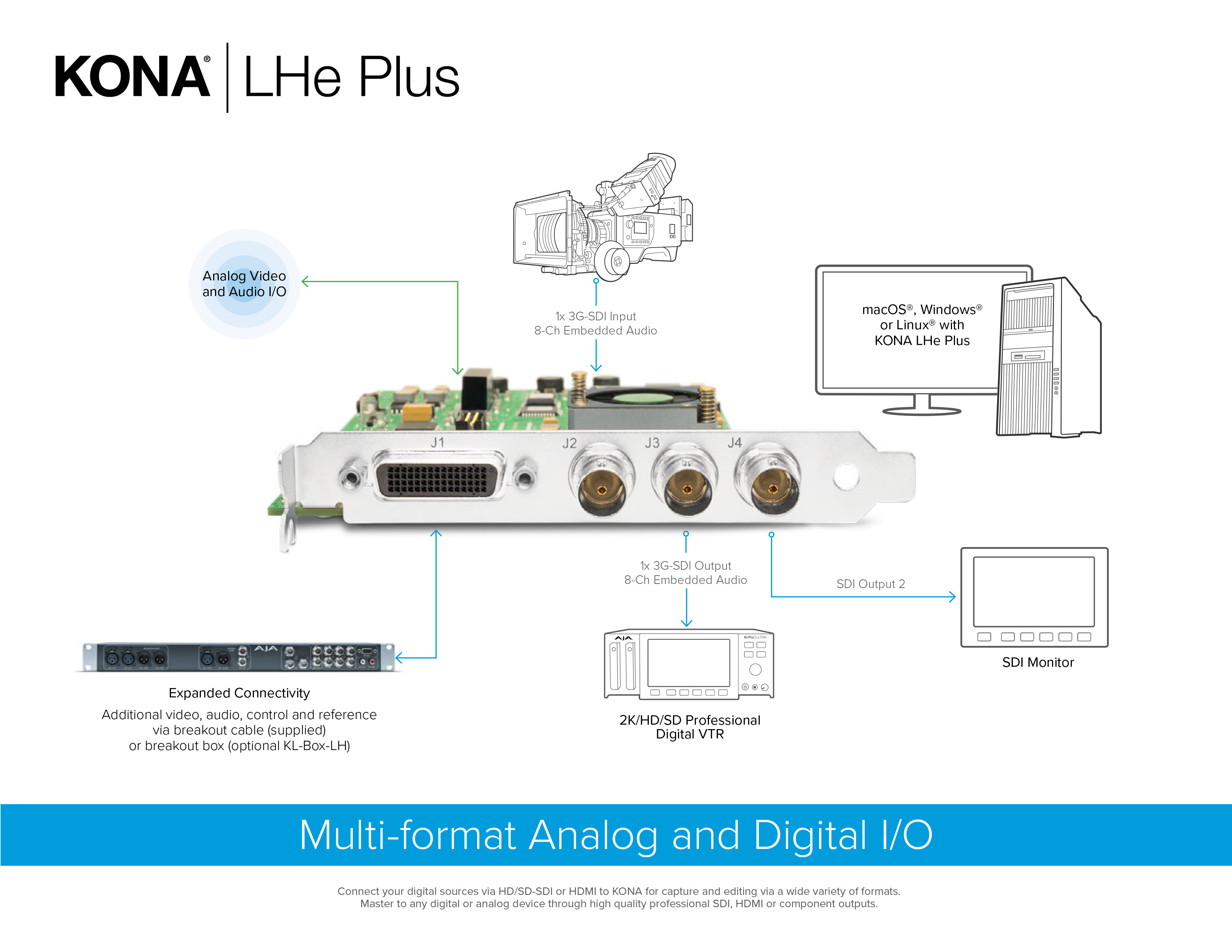 Designed for broadcast, post and ProAV, as well as OEM developers, KONA LHe Plus is a robust, cost efficient single-channel SDI I/O card with serial control, reference/LTC and analog video and audio. KONA LHe Plus features standard application plug-ins and supports capture, monitoring and/or playback with software applications from AJA, Adobe®, Avid®, Apple®, Telestream and more as well as AJA SDK support. KONA LHe Plus also enables simultaneous monitoring during capture (pass-through).