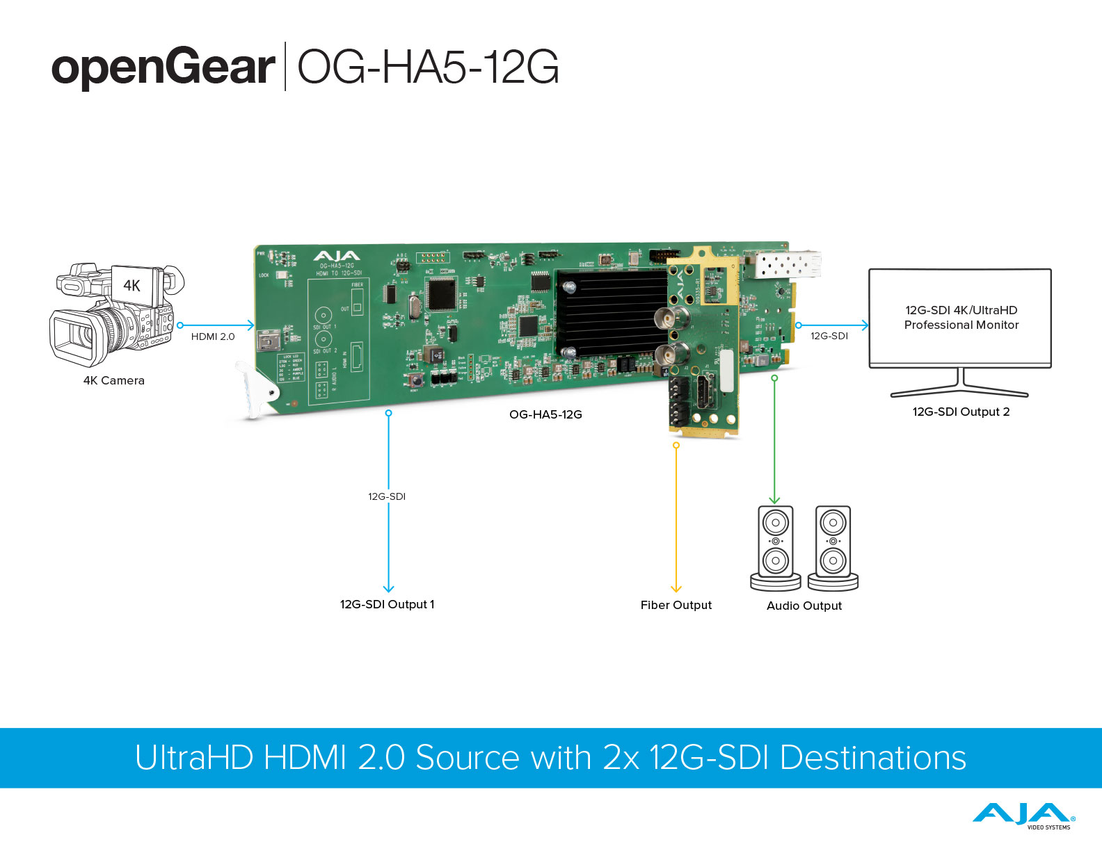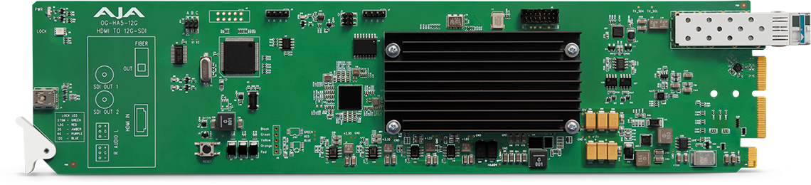 AJA’s OG-HA5-12G converts an HDMI 2.0 input to 12G-SDI for 4K/UltraHD single link outputs. OG-HA5-12G includes two 12G-SDI distribution amplifier outputs with 8 or 2-channels of embedded audio from an HDMI source.