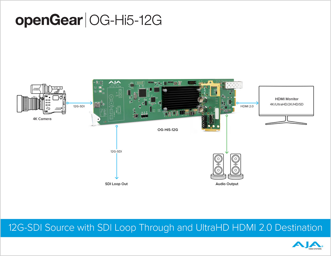The OG-Hi5-12G converts 12G-SDI to HDMI 2.0, with pristine image fidelity and HFR support up to 60p for 4K/UltraHD, in the popular openGear form factor. The OG-Hi5-12G provides an easy to deploy monitoring connection from professional 4K 12G-SDI devices to devices with HDMI 2.0 inputs. The OG-Hi5-12G can also generate HDR metadata in accordance with HDMI 2.0 and CTA-861-G.