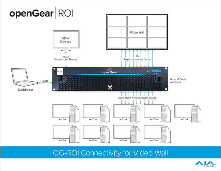 It is also possible to expand output options and create a large, synchronized video wall display. The workflow diagram shows 9 x OG-ROI-HDMI utilized in a rackframe to produce a video wall of 9 SDI monitors. Control over each OG-ROI-HDMI is provided via ethernet to the DashBoard. Each computer source is connected to an OG-ROI-HDMI input with the region of interest output via SDI. Simple controls and connectivity for the OG-ROI-HDMI can be used to create sophisticated and complex video wall presentations.