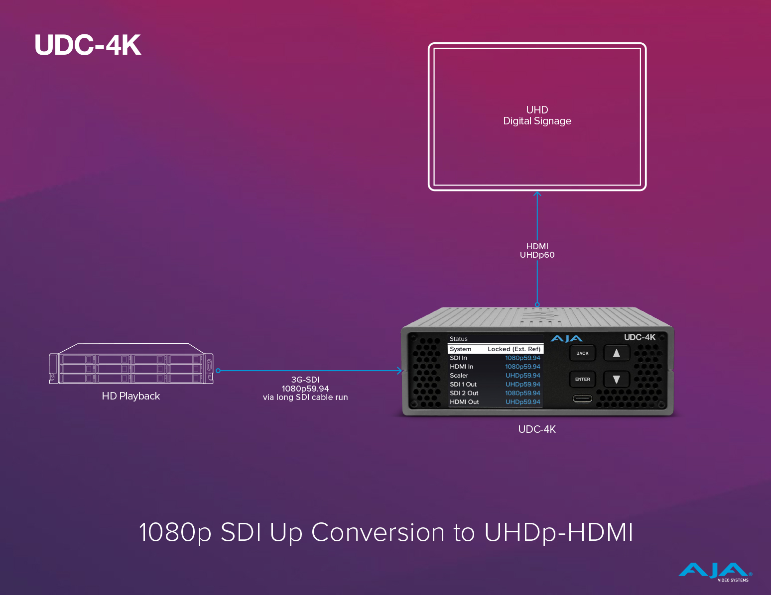 Convert 1080p SDI signals into stunning UHD HDMI for digital signage, in-venue displays, on-set displays, and more. The UDC-4K ensures clean scaling, vivid color fidelity, and instant connectivity, making it ideal for a wide range of productions, broadcast, live events, and proAV monitoring.