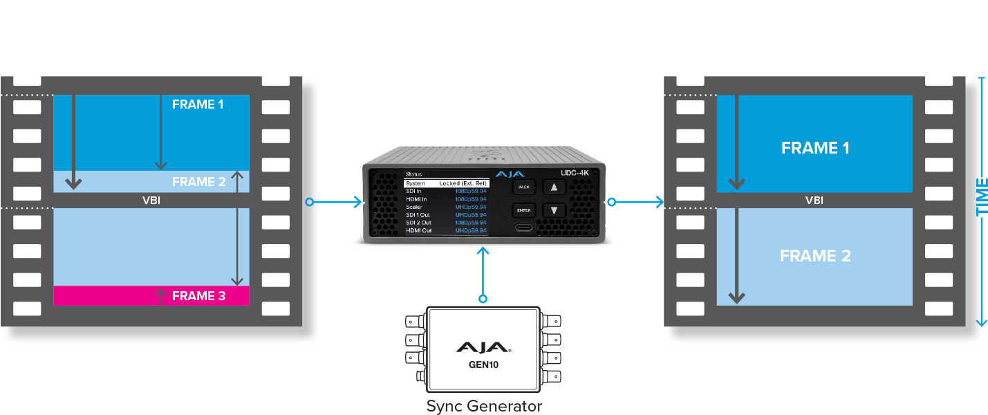 UDC-4K's frame synchronizer synchronizes wild or untimed video signals to a common timing reference, such as in a multicam sporting event, ensuring perfect timing alignment for seamless integration into your production. It’s an essential component in any broadcast, mobile, live event, proAV, or postproduction environment.