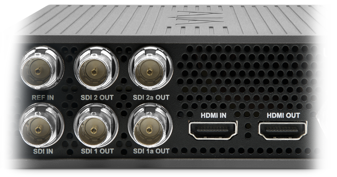 The UDC-4K features 12G-SDI and HDMI 2.0 inputs, four 12G-SDI outputs, and one HDMI 2.0 output. The multiple SDI outputs function as a distribution amplifier, or DA, enabling the transmission of a clean or processed signal to multiple destinations. It offers SDI and HDMI loop outputs for simple confidence monitoring or pass-through to the next device. A reference input enables the UDC-4K to lock to an external reference, or it can lock to the SDI or HDMI input, providing frame synchronization capabilities for untimed video signals.