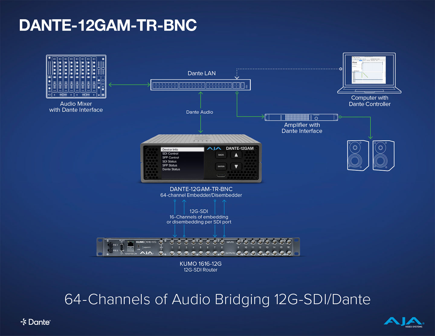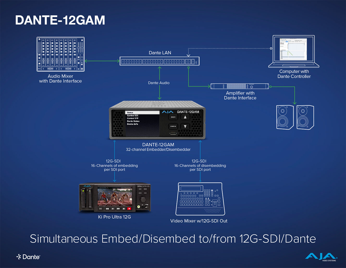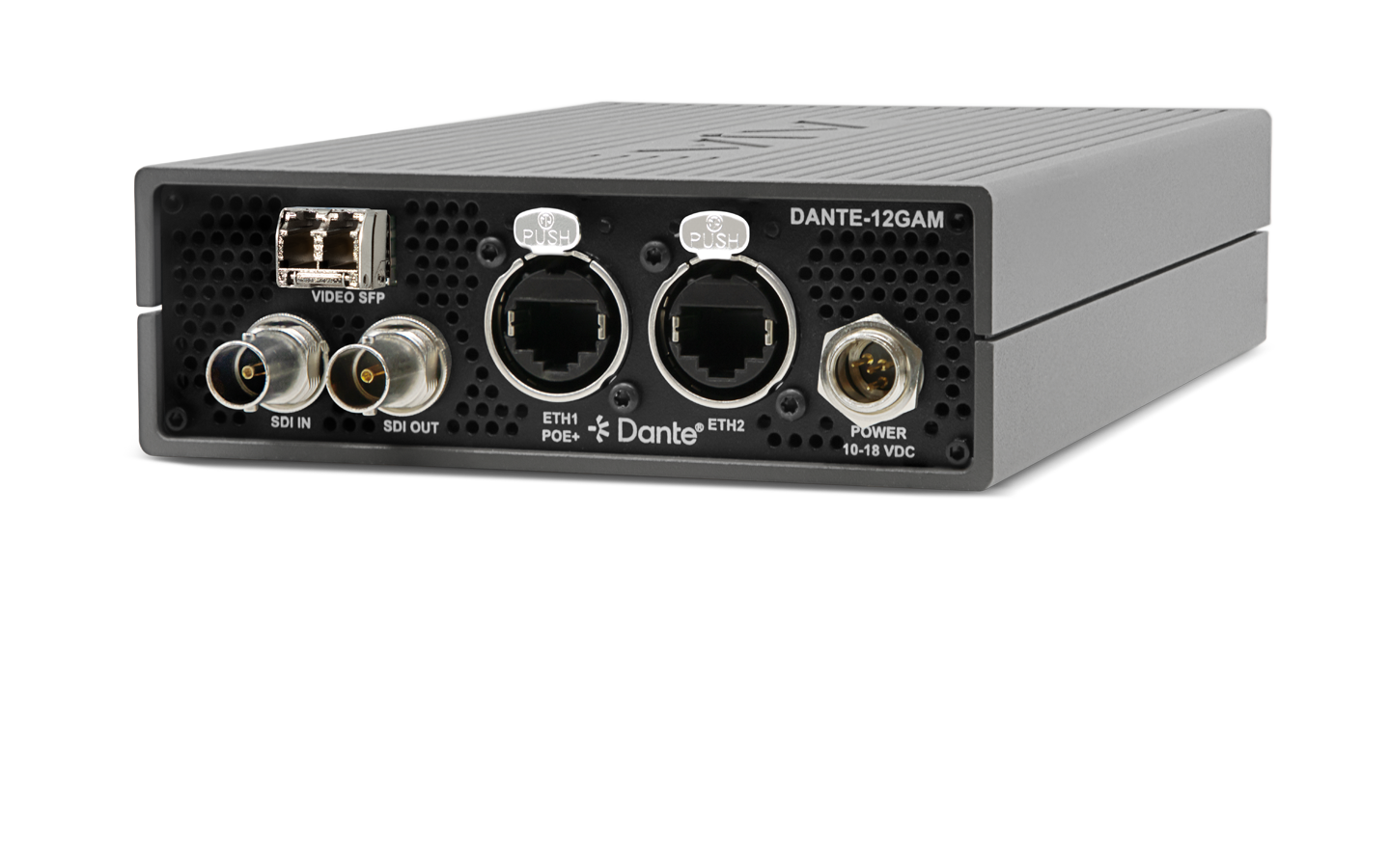 The DANTE-12GAM converter offers the power and flexibility of professional connectivity to plug and play into your existing SDI and Dante audio infrastructures.