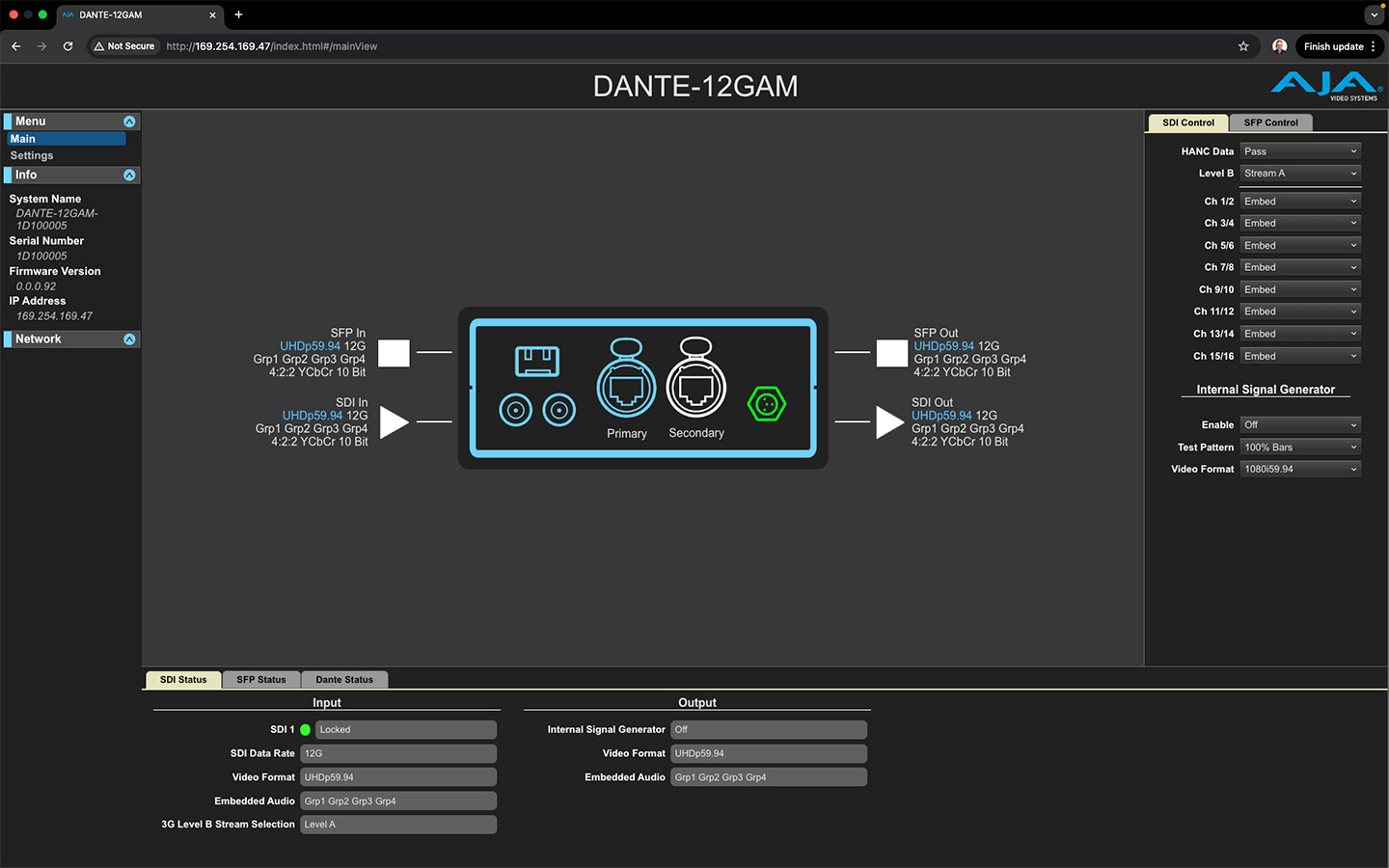 In addition to the front panel buttons and LCD screen, the DANTE-12GAM can also be confirgured and controlled by a user friendly web UI served by its integrated web server. The web UI shows the system status and connections to the Dante audio network. It can be used to configure network settings and update firmware. Applicable controls and status information are mirrored on the LCD front display on the device.