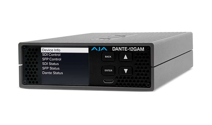 The DANTE-12GAM utilizes a rugged new aluminum enclosure, offering a front panel display, physical push-button controls, USB-C connectivity for initial Static IP configuration, and active cooling designed with front-to-back airflow. The onboard display reports status and configuration and is paired with buttons for enter, back, up, and down for easy access to settings for standalone operation.