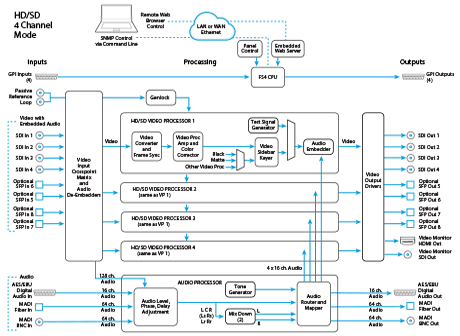 Four Channel Mode offers 4x 2K/HD/SD channels of simultaneous conversion and processing, all within an elegant 1RU chassis for multi-channel high density delivery.