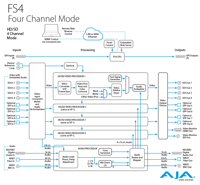 In Single Channel Mode, FS4 will up-convert your HD or SD materials to 4K/UltraHD or down-convert your 4K/UltraHD to HD and supports a huge array of audio channels over Embedded SDI, AES, and MADI for an incredible 272x208 matrix of audio processing capabilities.