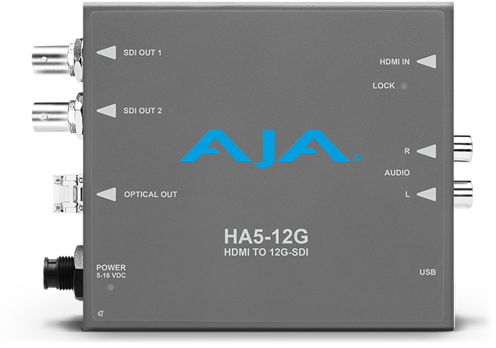 AJA’s HA5-12G converts an HDMI 2.0 input to 12G-SDI for 4K/UltraHD single link outputs. HA5-12G includes two 12G-SDI distribution amplifier outputs with 8 or 2-channels of embedded audio from an HDMI source or two-channel analog audio (RCA) input.