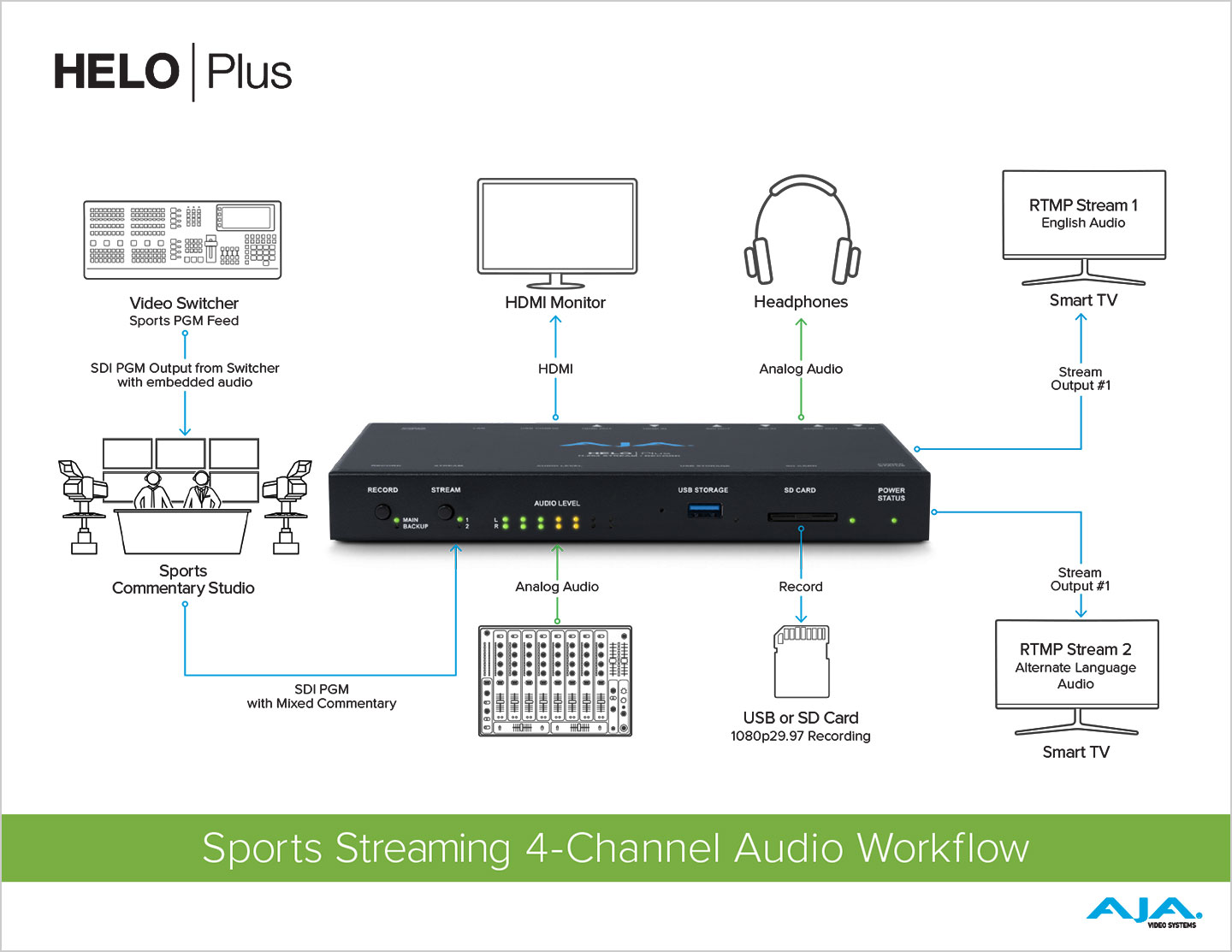The 4-channel audio option on the HELO Plus expands the number of audio channels available for streaming and recording from a single stereo pair to two stereo pairs, for a total of four channels.