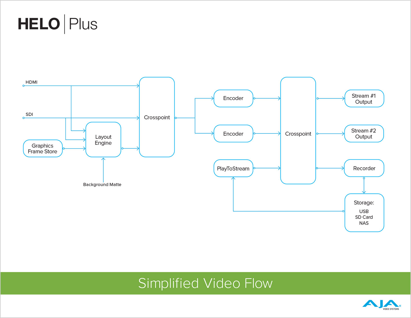 The simplified signal flow for video within HELO Plus neatly highlights the flexibility of the device. Tracing a simple pathway for each video input illustrates the encoder, graphics, recording, and new PlayToStream options.