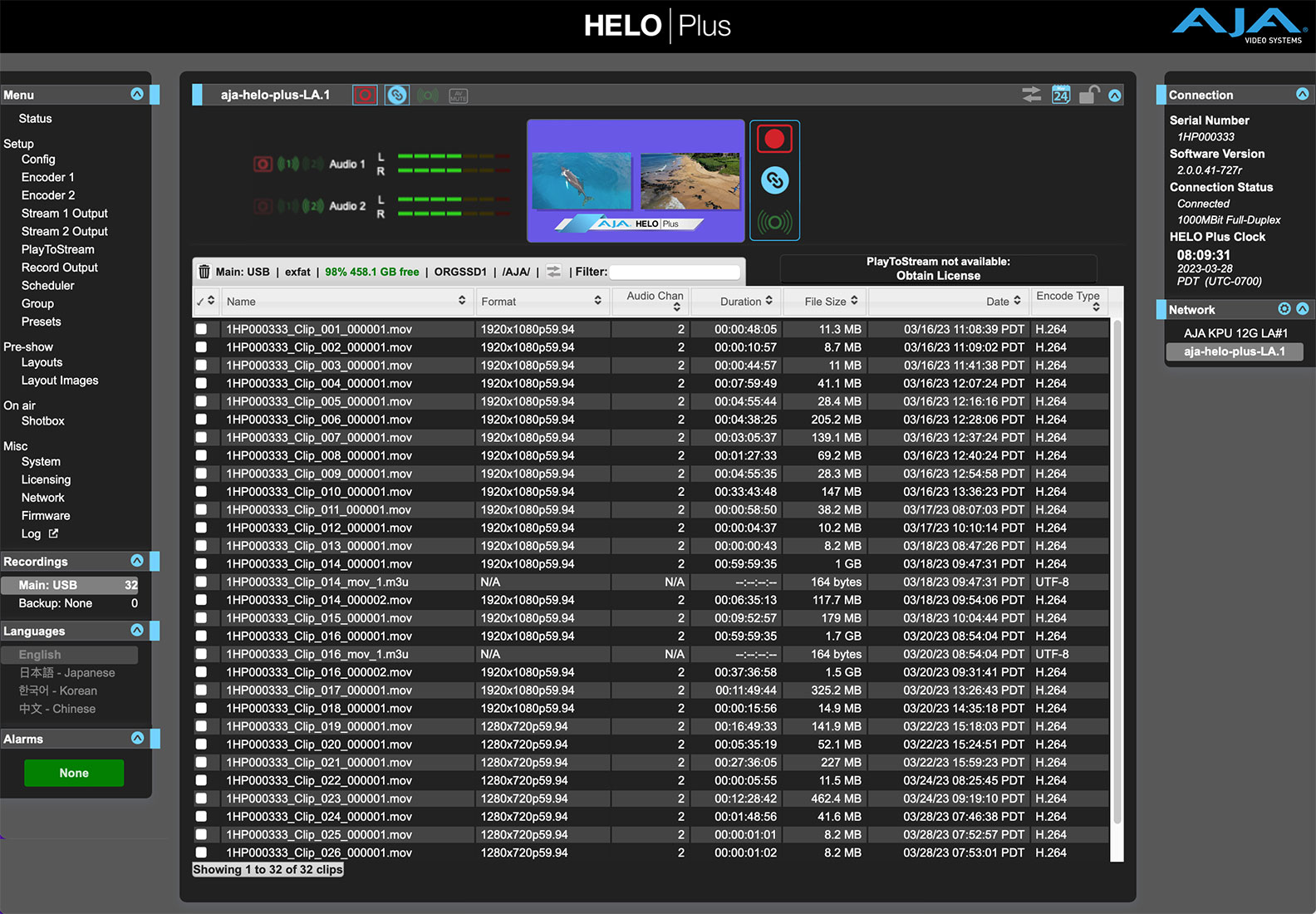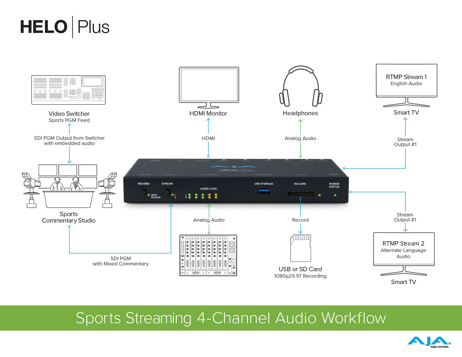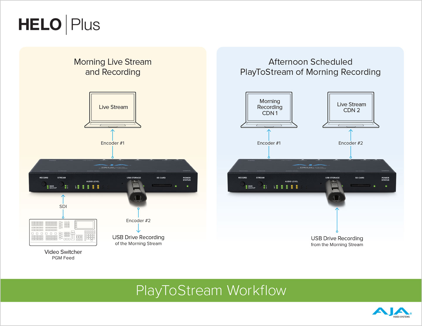 The system can live stream (and record) video out of one stream output while simultaneously performing a PlayToStream action on the other stream output. In other words, a single HELO Plus can simultaneously play back a previously recorded session, stream a live session and record that live session without the need for additional equipment. This expanded functionality is available to purchase directly in the HELO Plus web browser interface or from shop.aja.com.