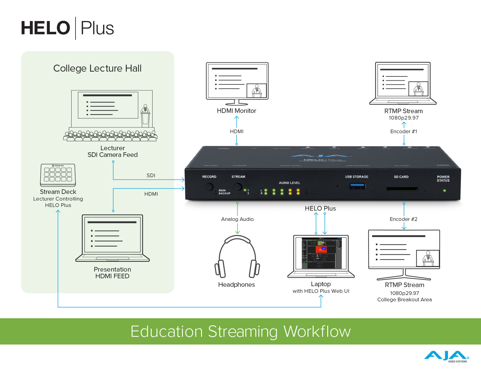 In this use case, a college lecture is taking place. The HELO Plus receives video over SDI of the lecturer. At the same time, the presentation on the lecturer’s laptop is being output via HDMI to the HDMI of the HELO Plus.