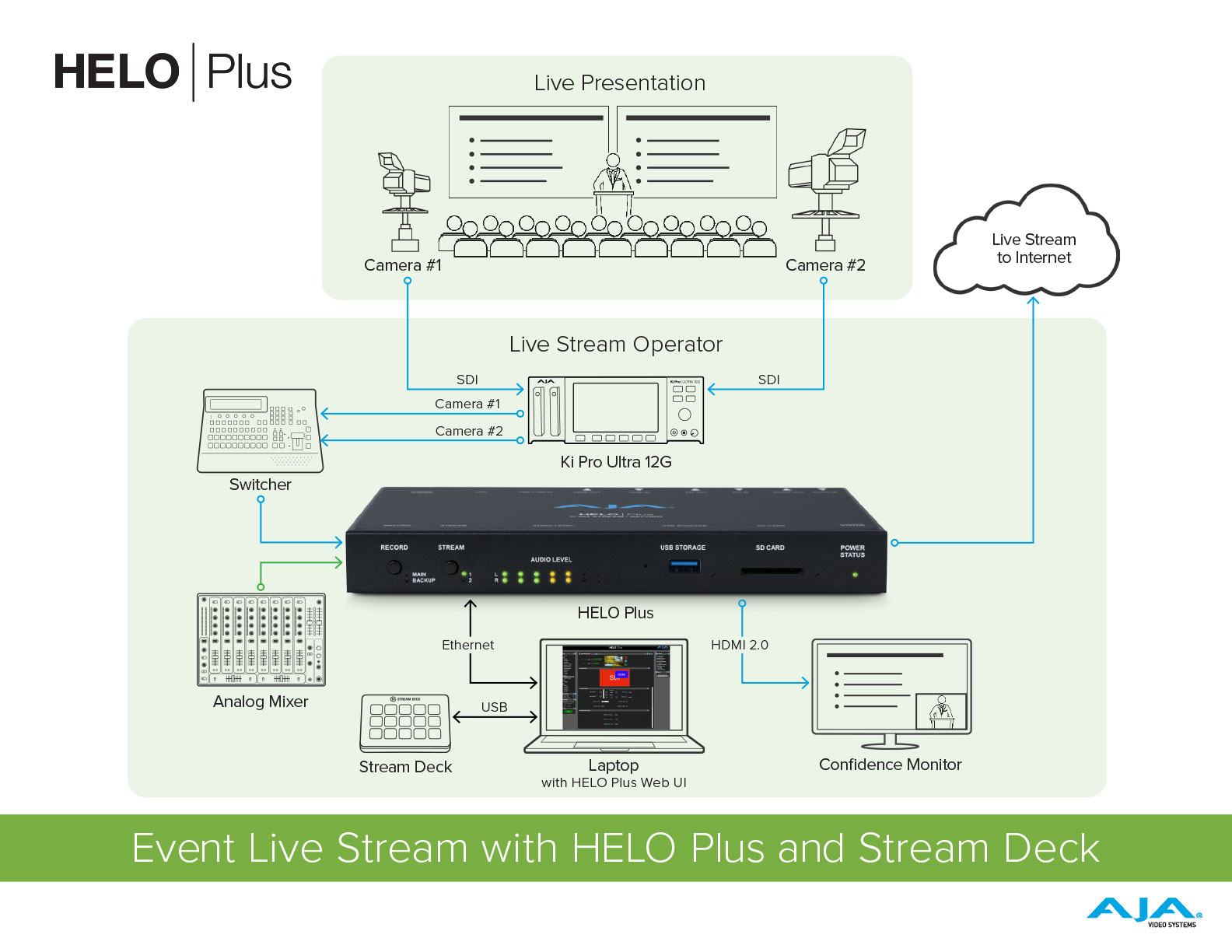 This workflow shows how the HELO Plus, in conjunction with the Stream Deck, can be used to add graphics and stream any live event. You can then take the ISO recordings from the Ki Pro Ultra 12G and the live stream recording from the HELO Plus to create your final recorded webinar package for later posting online or restreaming with the HELO Plus.