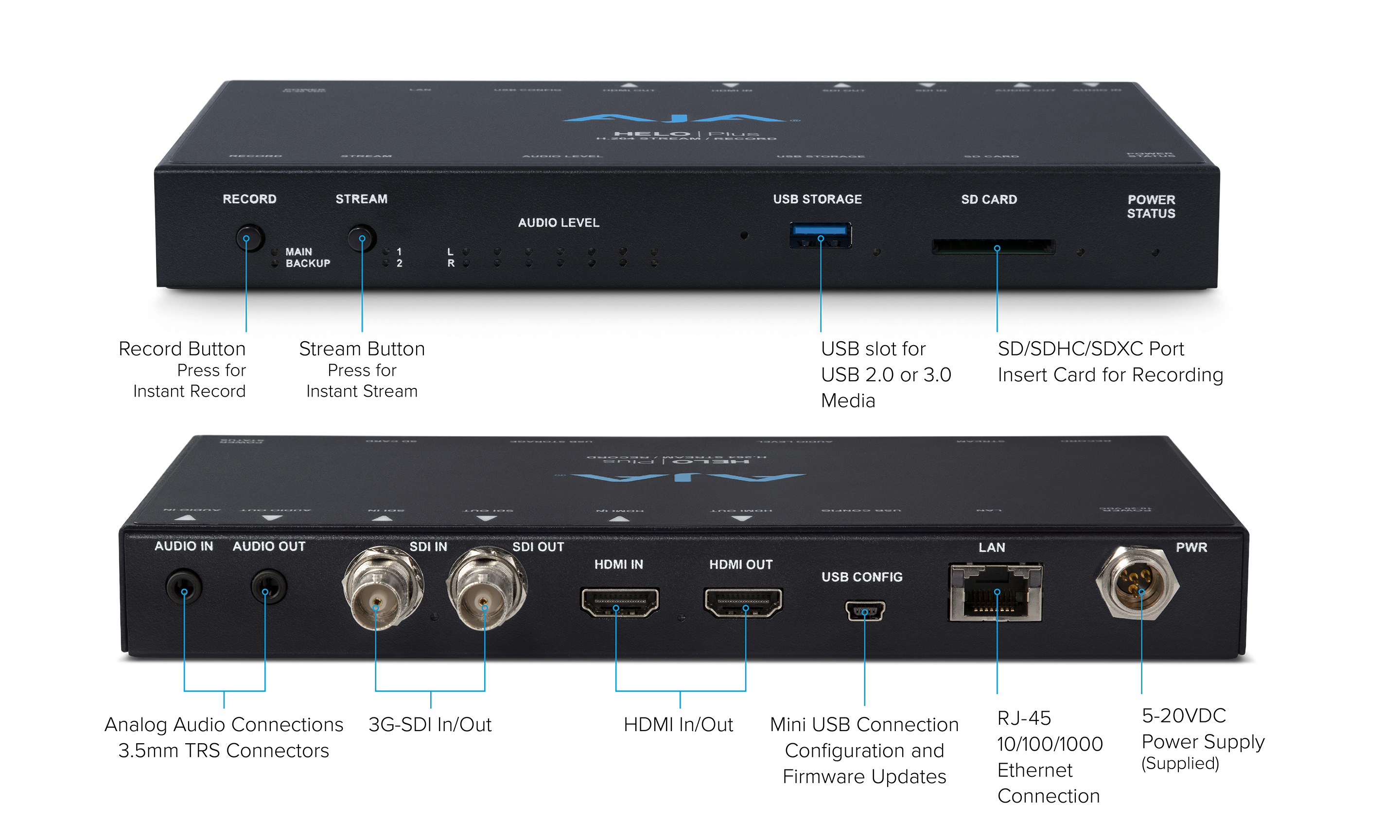HELO Plus is a compact, advanced H.264 streaming and recording stand-alone appliance. HELO Plus offers both SDI and HDMI I/O with the capability to stream up to 1080p60 to a Content Delivery Network and record simultaneously. Two separate streaming destinations can be set up, and recordings can be made to a combination of SD card, USB storage, and NFS or SMB network storage. HELO Plus also provides Picture-In-Picture and graphics functionality in hardware for compelling presentations made simple.