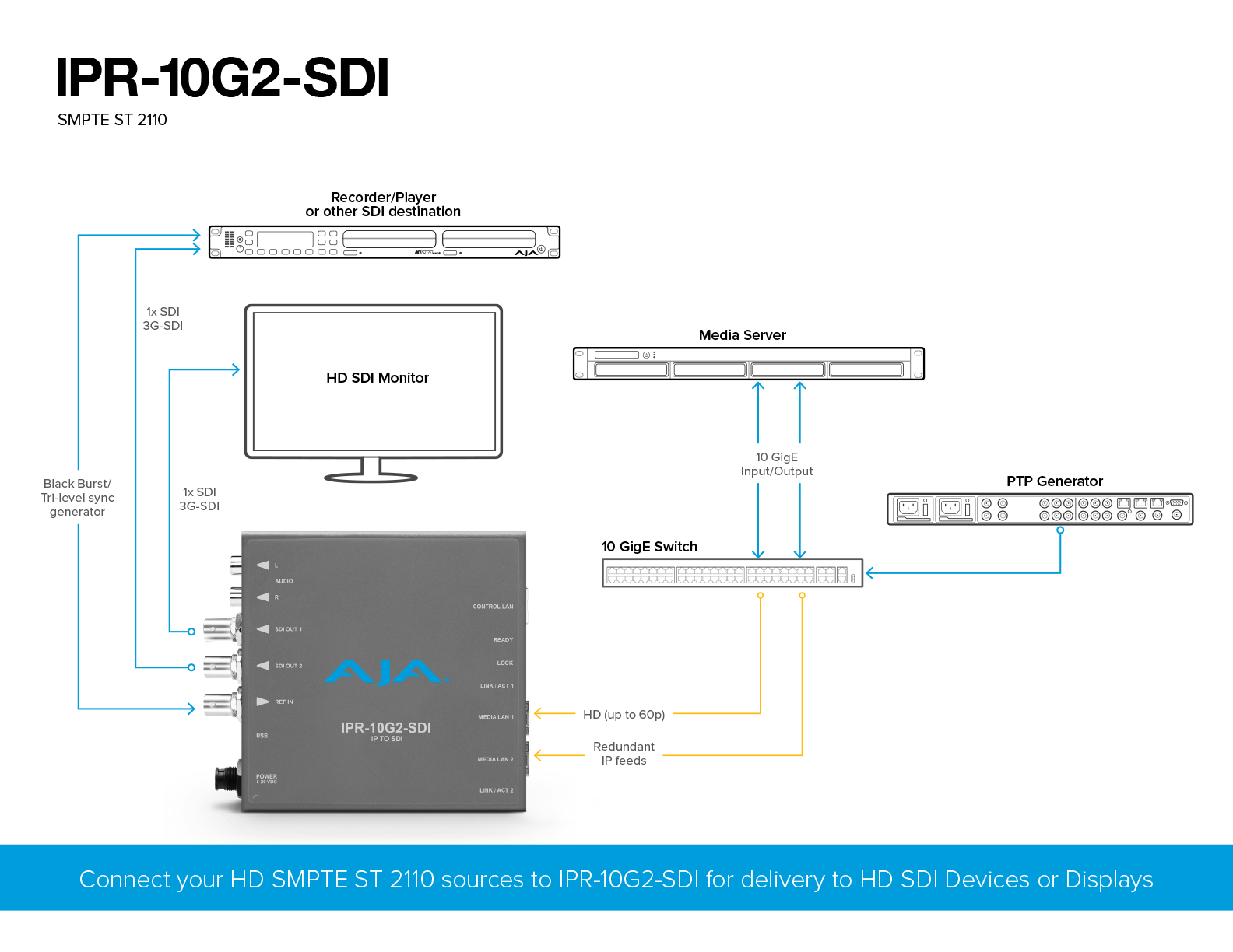 The AJA IPR-10G2-SDI receives SMPTE ST 2110 IP video and audio, then formats the data for output over 3G-SDI.