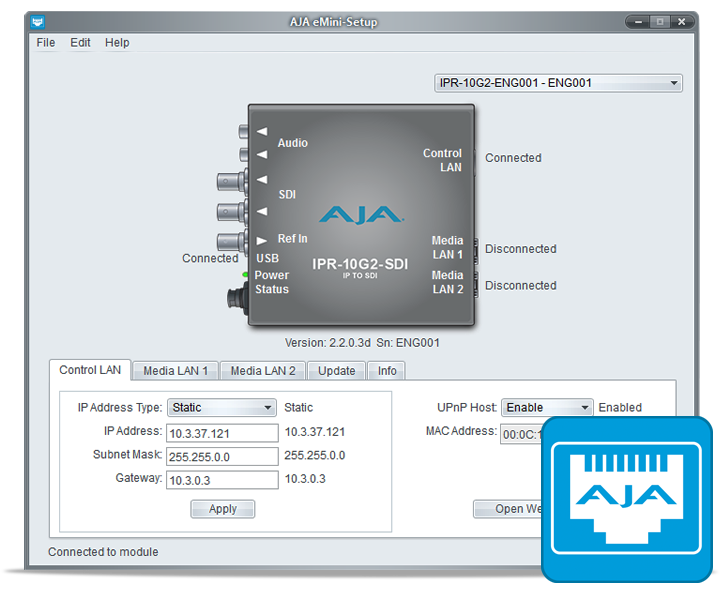 IPR-10G2-SDI provides two key methods for control. The Control LAN Ethernet port enables full setup and control of the Mini-Converter from web browsers on any platform and REST clients. The mini-USB connector facilitates quick and simple initial network configuration, and firmware updates with AJA eMini Setup Software.