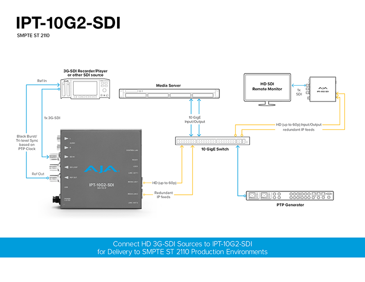 IPT-10G2-SDI Mini-Converter transmits a SMPTE ST 2110 essence derived from an incoming 3G-SDI input source. Providing two SFP+ cages for redundancy protection via "hitless switching", IPT-10G2-SDI is rugged, quiet and fanless. AJA Mini-Converter design is ideal for placement in a wide range of display and device scenarios, from studios to field.