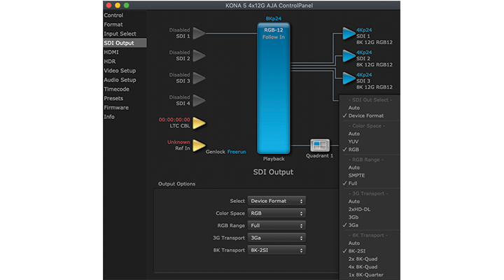 AJA Control Room provides VPID signaling for SDR/HDR Transfer Characteristics, Colorimetry and Luminance transfer characteristics over SDI, bringing flexible output options to your KONA 5. HDMI ports that were already HDR compatible will work simultaneously, for HDR output via both SDI and HDMI.