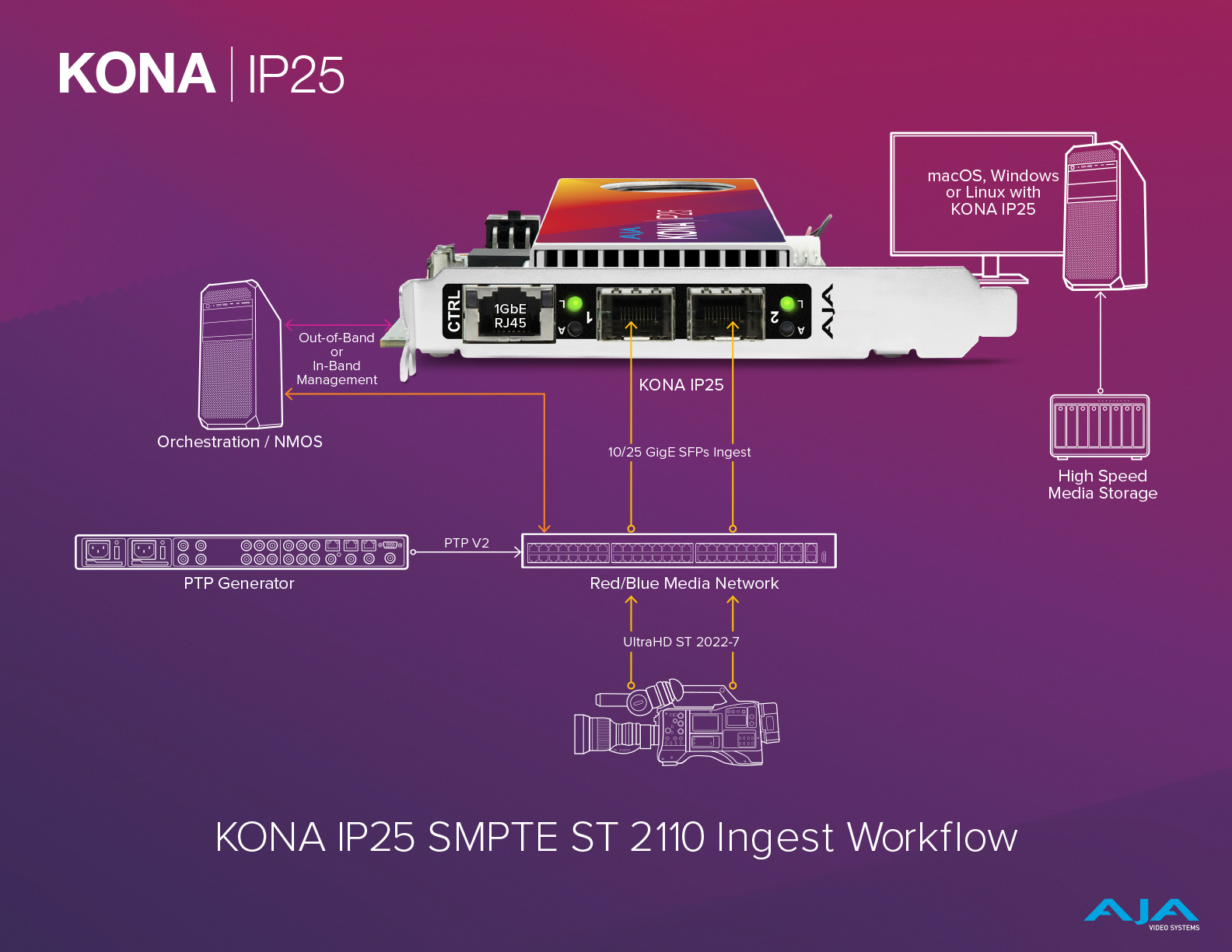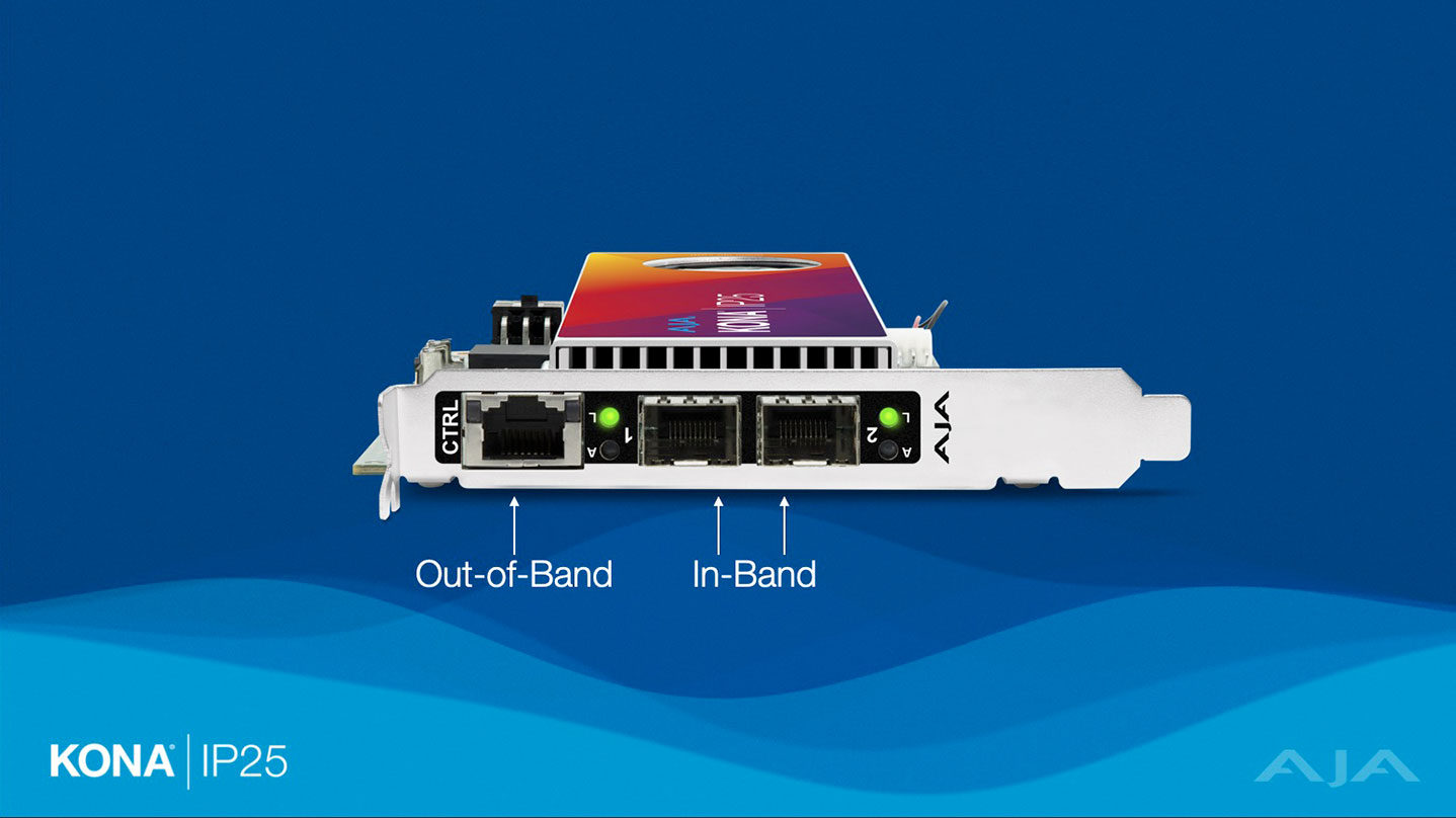 All SMPTE ST 2110 configuration, control, and timing functions (NMOS and PTPv2) are handled on the KONA IP25, independent of the host computer with configuration and control options for either In-Band (media network via SFPs) or Out-of-Band (control network via RJ-45) capability.