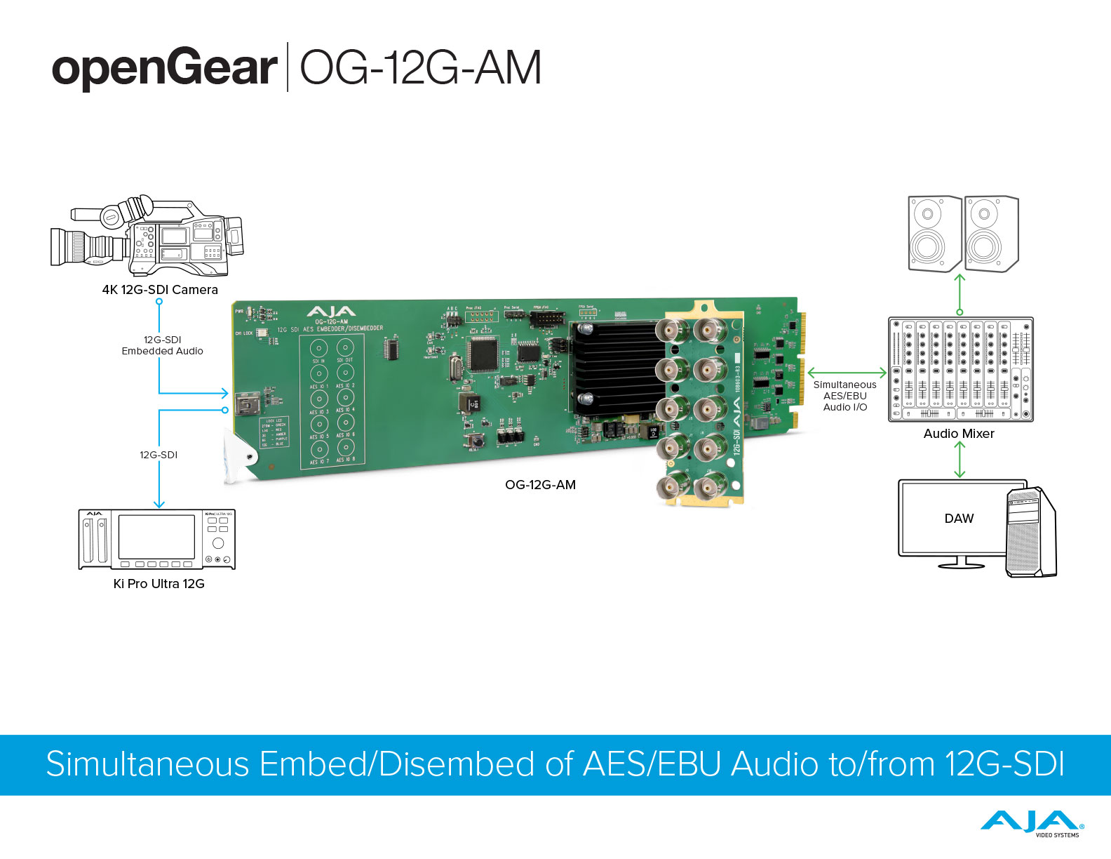 The OG-12G-AM is a 16-channel AES/EBU audio embedder/disembedder openGear card with support for 12G-SDI input and output up to 4K/UltraHD.
