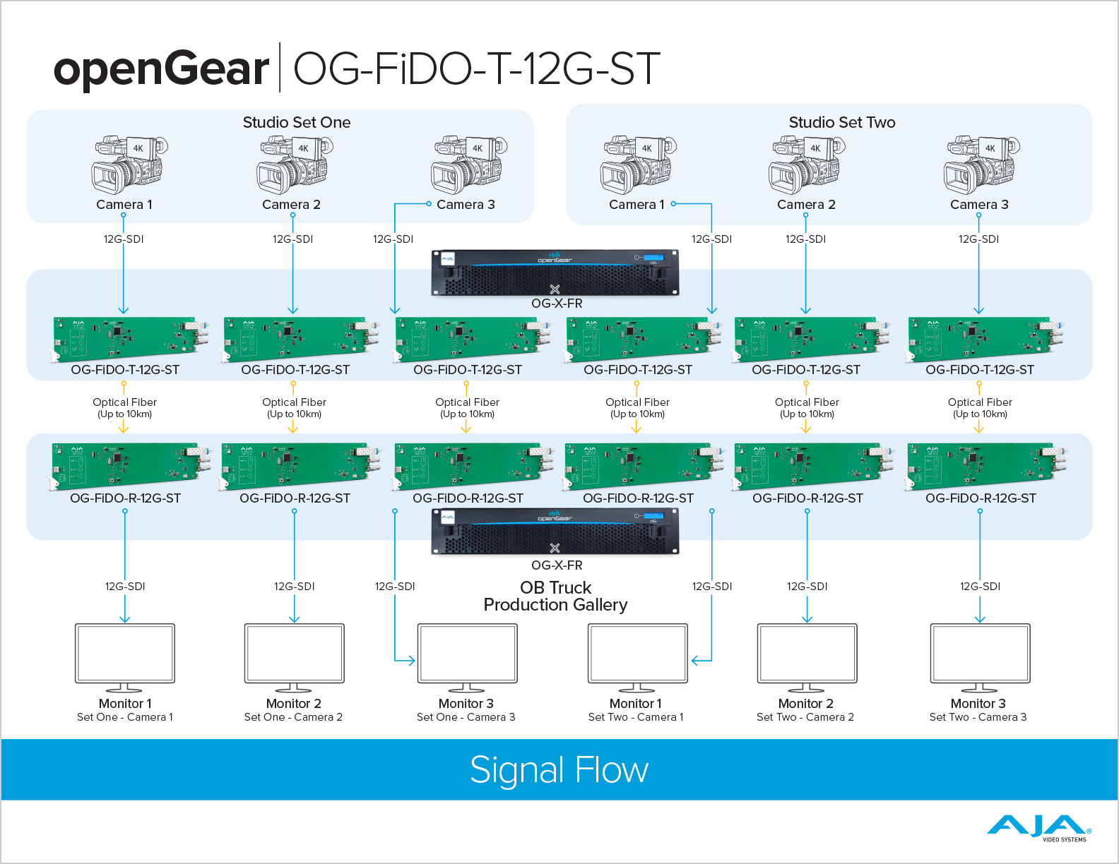 This diagram shows six openGear OG-FiDO-T-12G-ST cards being used in an OG-X-FR rack frame, which highlights the high density capability of the openGear platform. The studio sets each contains a total of six 12G-SDI cameras connected to six OG-FiDO-T-12G-ST cards, which provide the 12G-SDI to fiber ST conversion. Fiber runs are then extended up to 10km to an OB production truck with six OG-FiDO-R-12G-ST cards in an OG-X-FR rack frame. The Production Gallery receives six discrete camera feeds as 12G-SDI via the OG-FiDO-R-12G-ST, driving the gallery video monitors with ultra low latency.