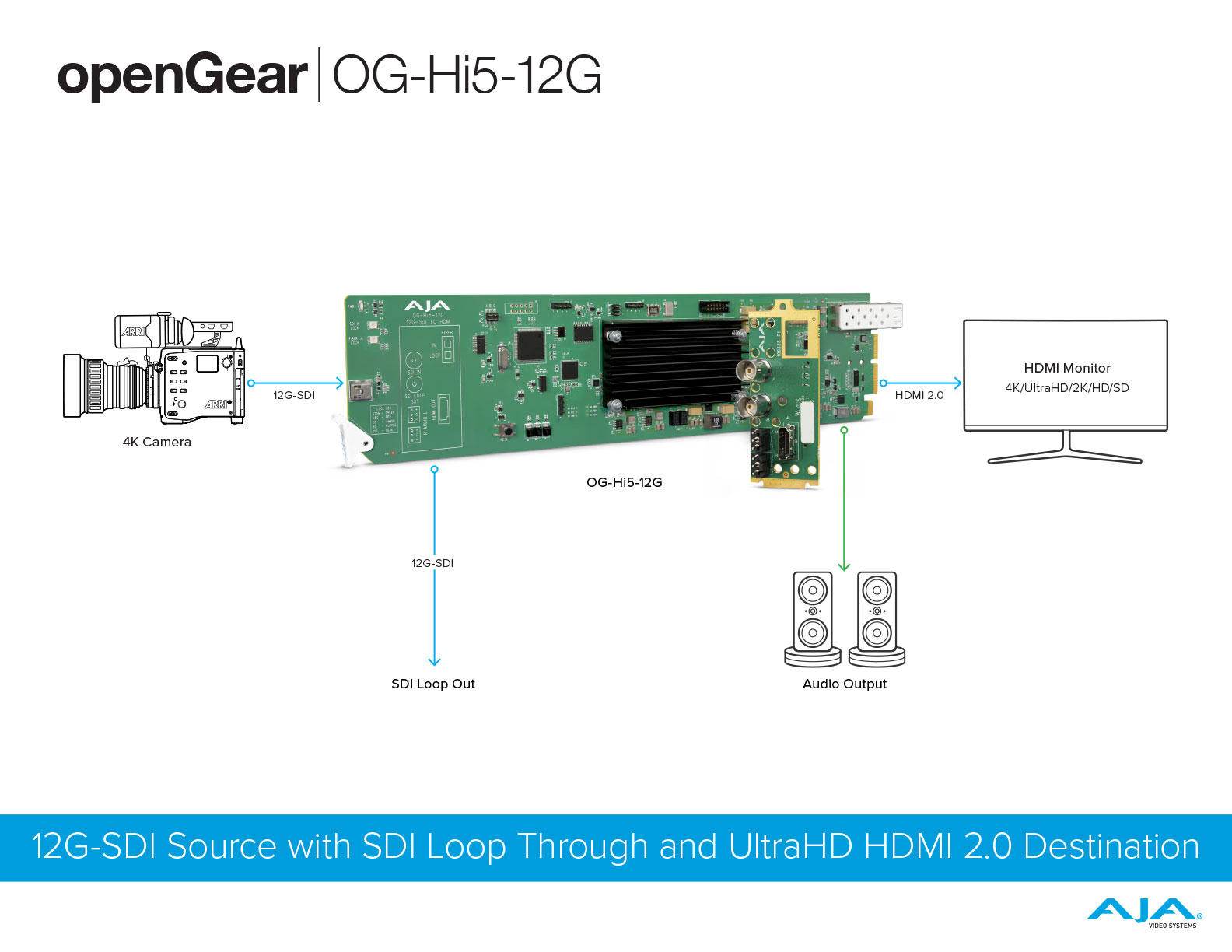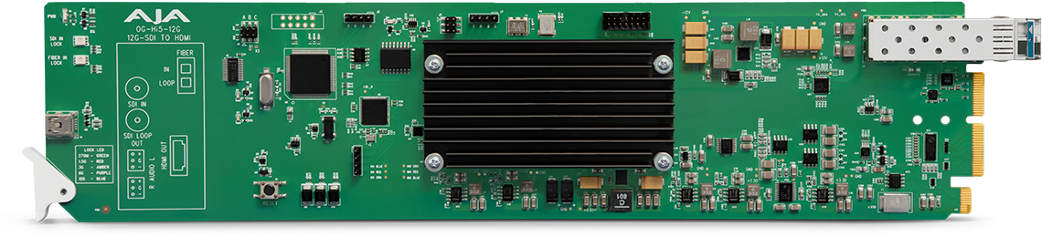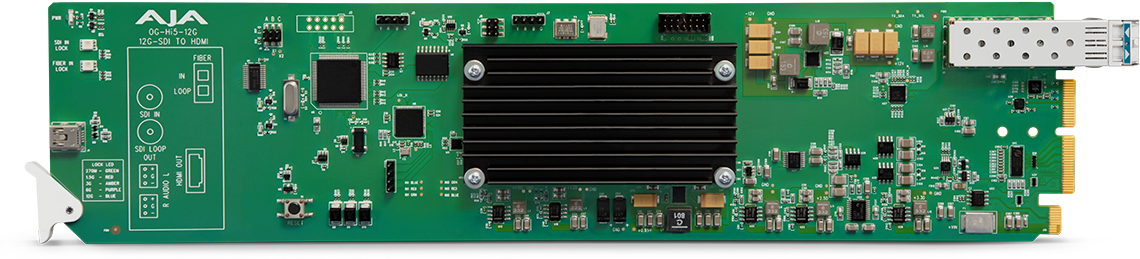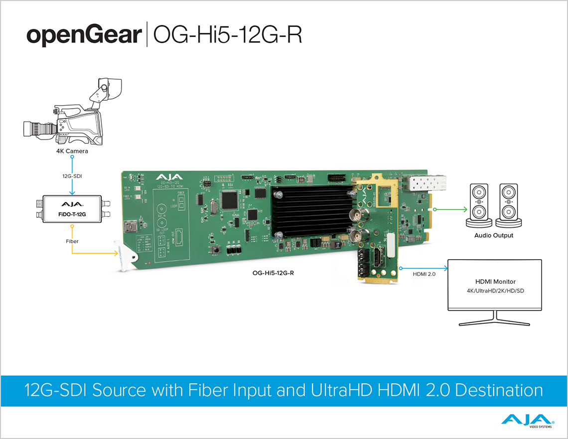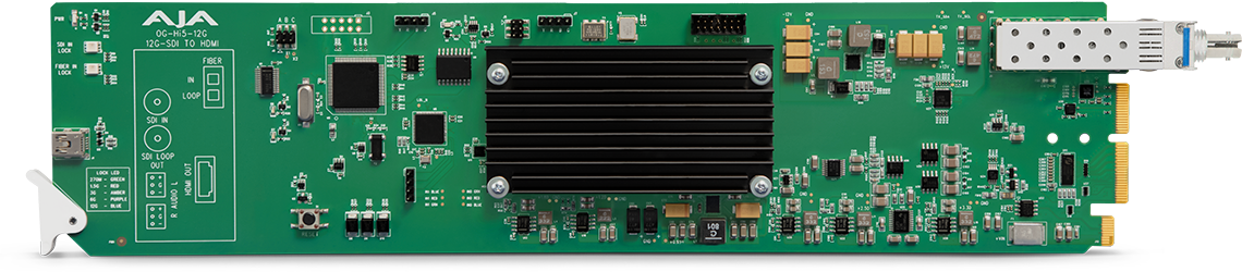 The OG-Hi5-12G converts 12G-SDI to HDMI 2.0, with pristine image fidelity and HFR support up to 60p for 4K/UltraHD, in the popular openGear form factor. The OG-Hi5-12G provides an easy to deploy monitoring connection from professional 4K 12G-SDI devices to devices with HDMI 2.0 inputs. The OG-Hi5-12G can also generate HDR metadata in accordance with HDMI 2.0 and CTA-861-G.