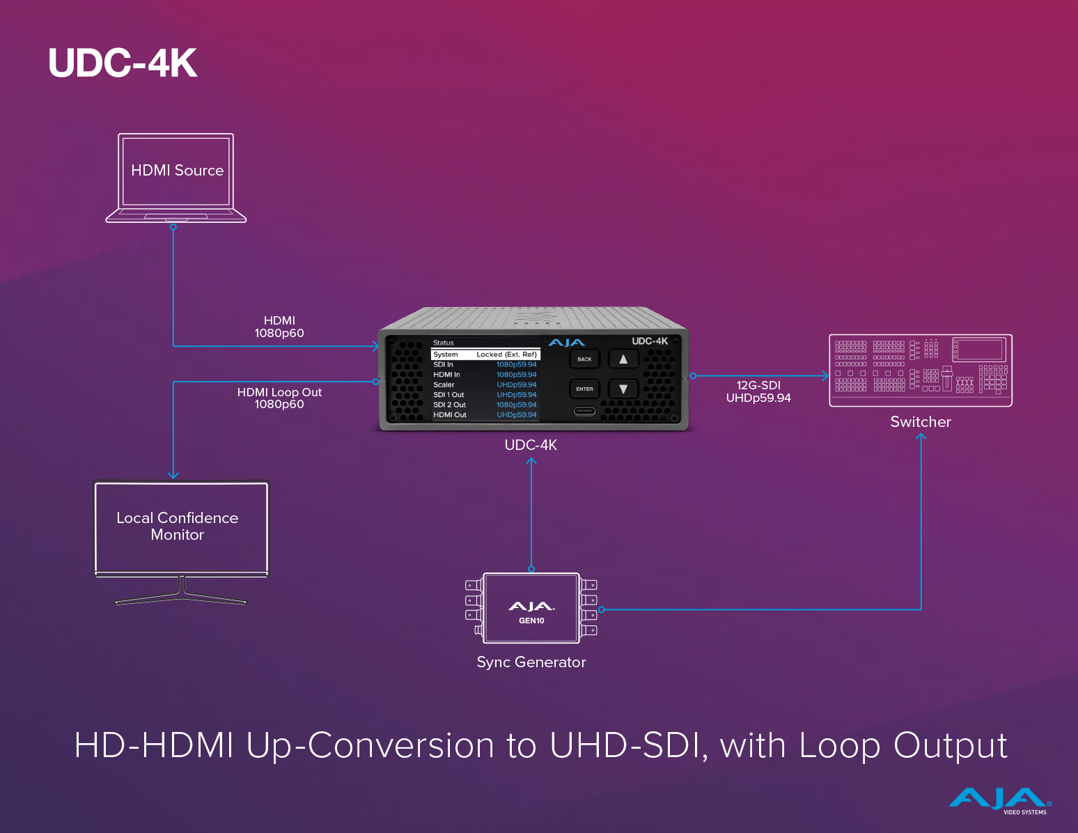 In this workflow, the UDC-4K is up-converting HD-HDMI sources to high resolution UHD 12G-SDI, and outputs are locked to a supplied reference for use in a broadcast, production, or any venue where a high quality, rock solid, synced HDMI to SDI converted signal is needed. You can utilize the HDMI loop out for local confidence monitoring.