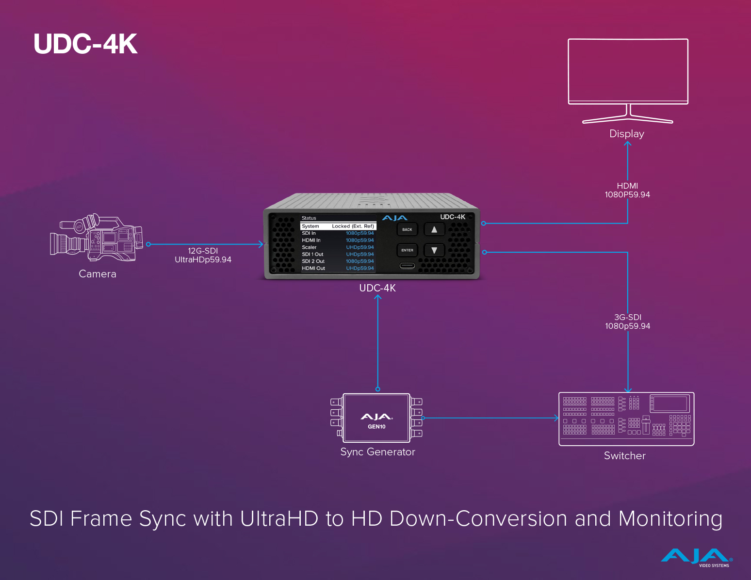 Designed on AJA’s industry-leading conversion technology, the UDC-4K offers the highest-quality required in professional broadcasting, live events, and other critical AV environments. UDC-4K’s wide range of conversion possibilities makes it ideal for aligning disparate sources to a common format and timing reference, integrating legacy signals into higher resolution workflows, and handling many production challenges that may arise. It even offers utility frame rate conversion to convert 59.94 to 50/60 or 50/60 to 59.94 frame rates.